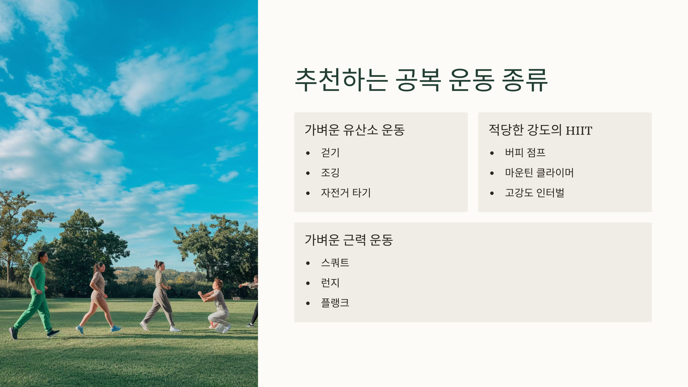 공복에 적합한 운동은 저강도 위주예요. 파워워킹, 요가, 필라테스, 스트레칭, 산책 등 부드럽게 몸을 깨우는 운동이 효과적이죠. 심박수를 너무 높이지 않는 것이 핵심이에요.