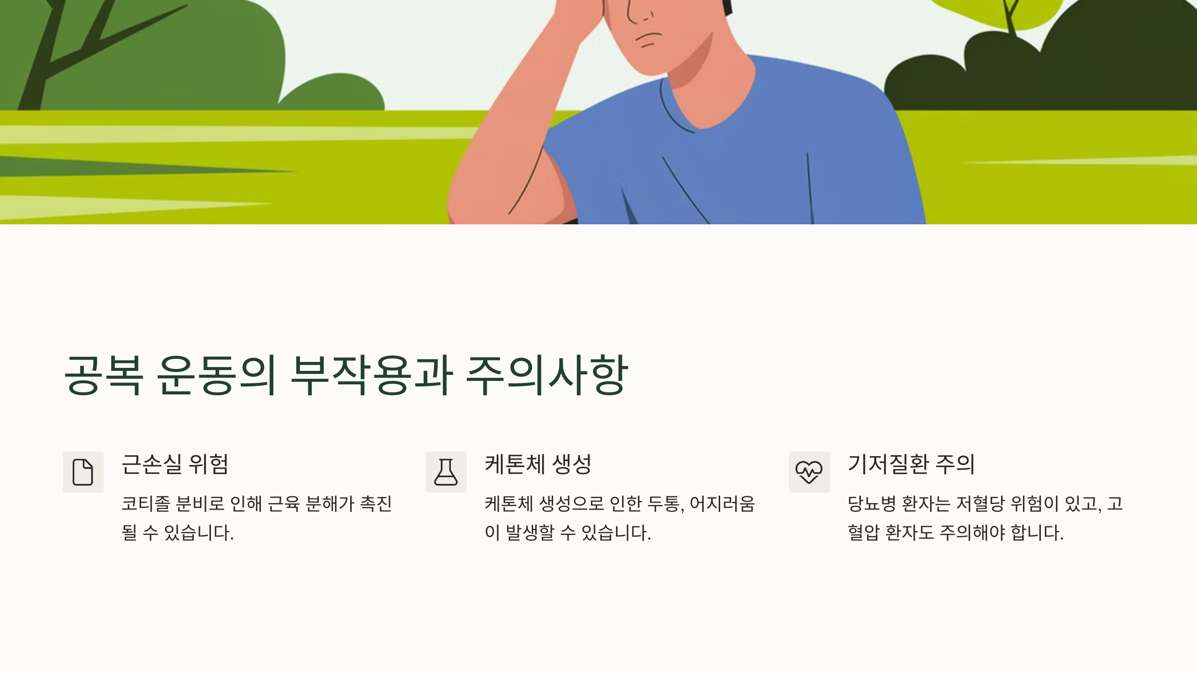 하지만 단점도 있어요. 에너지원이 부족하면 체력이 떨어지고, 운동 지속 시간이 짧아질 수 있어요. 또 근육 분해가 일어날 수 있기 때문에 공복 운동만 무작정 반복하는 건 비추예요.