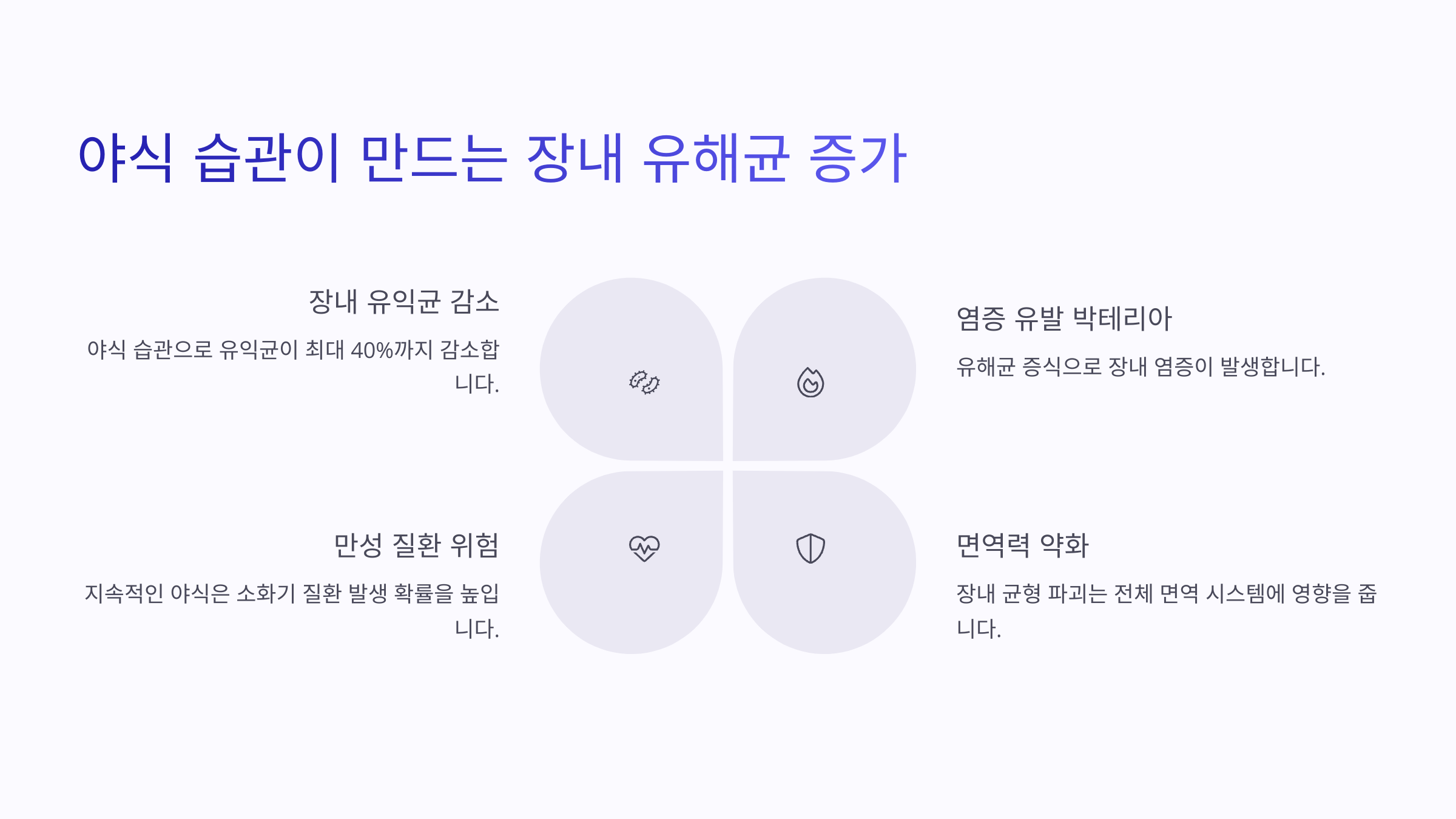 야식을 반복적으로 먹으면, 장내 미생물 환경이 바뀌게 돼요. 특히 고지방, 고당분 위주의 야식은 유해균이 좋아하는 환경을 만들어 주죠. 유해균은 밤 시간대 장내 활동이 둔해진 틈을 타 번식하기 쉬워요.