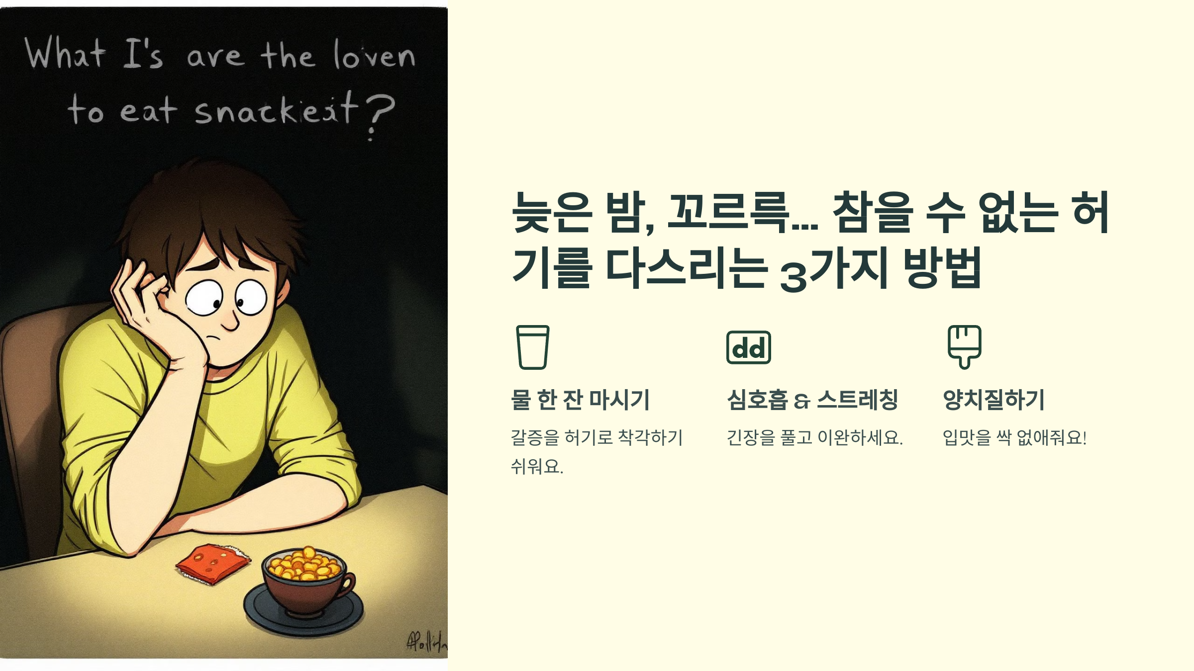 야식 욕구가 생길 때 반드시 음식을 먹어야 하는 것은 아니에요. 몇 가지 방법만 알면 배고픔을 줄일 수 있답니다!