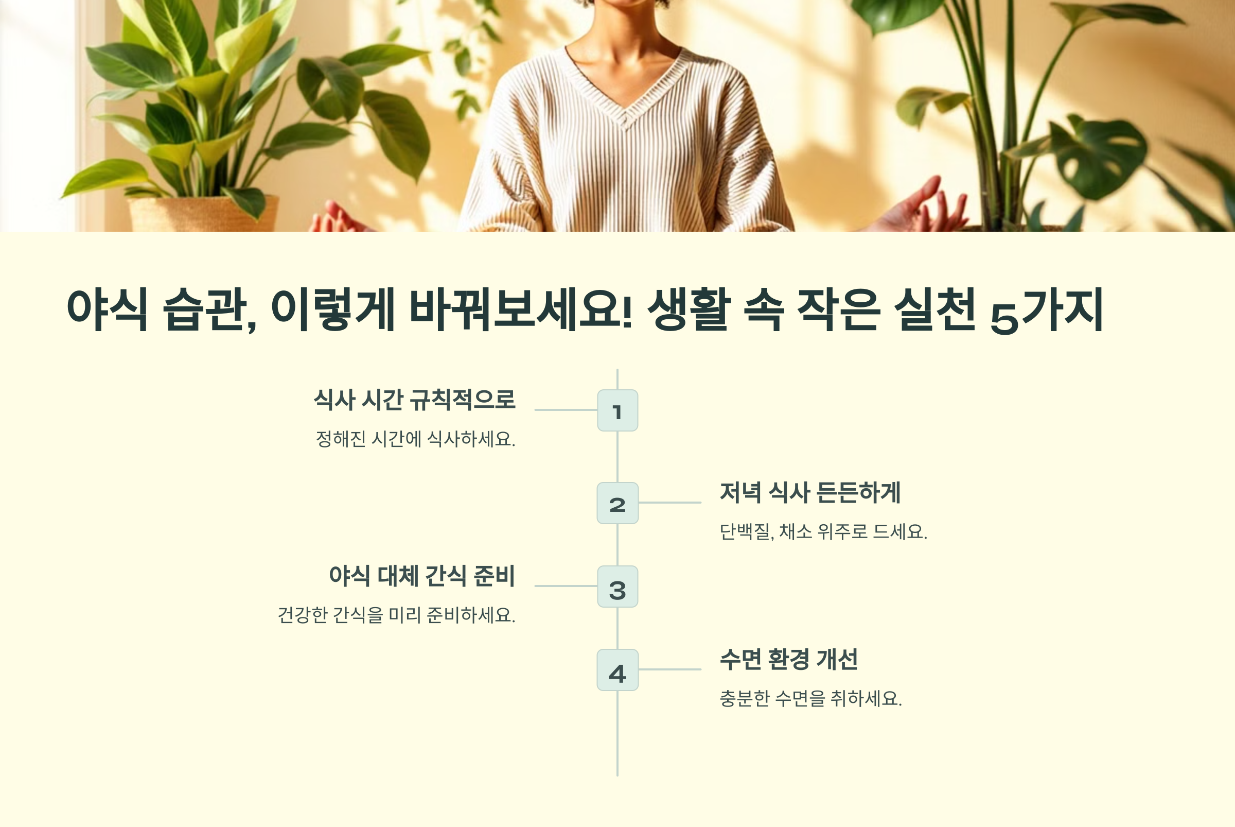야식을 줄이려면 단순히 참는 것이 아니라 생활 습관을 바꾸는 것이 중요해요! 야식을 부르는 원인을 파악하고, 미리 대처하는 방법을 익히면 자연스럽게 야식 욕구를 줄일 수 있답니다.