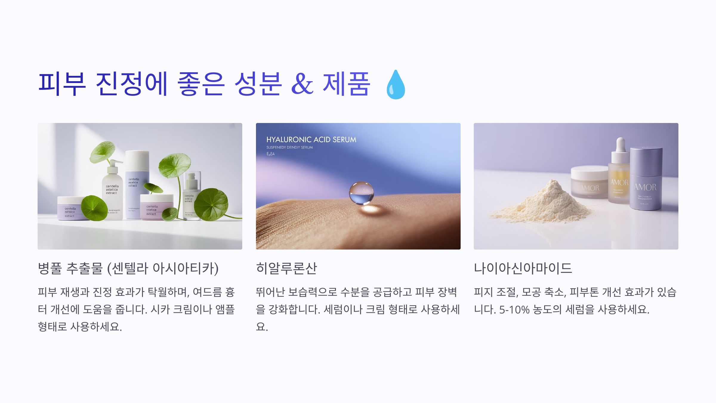 여름철 피부는 외부 자극을 많이 받기 때문에 진정 케어에 적합한 성분을 잘 선택하는 것이 중요해요. 피부에 무리가 가지 않으면서도 빠르게 열감을 낮추고 염증을 가라앉혀주는 성분들이 효과적이에요. 이런 성분은 단순한 보습을 넘어서 ‘피부 컨디션 회복’을 도와줘요.
