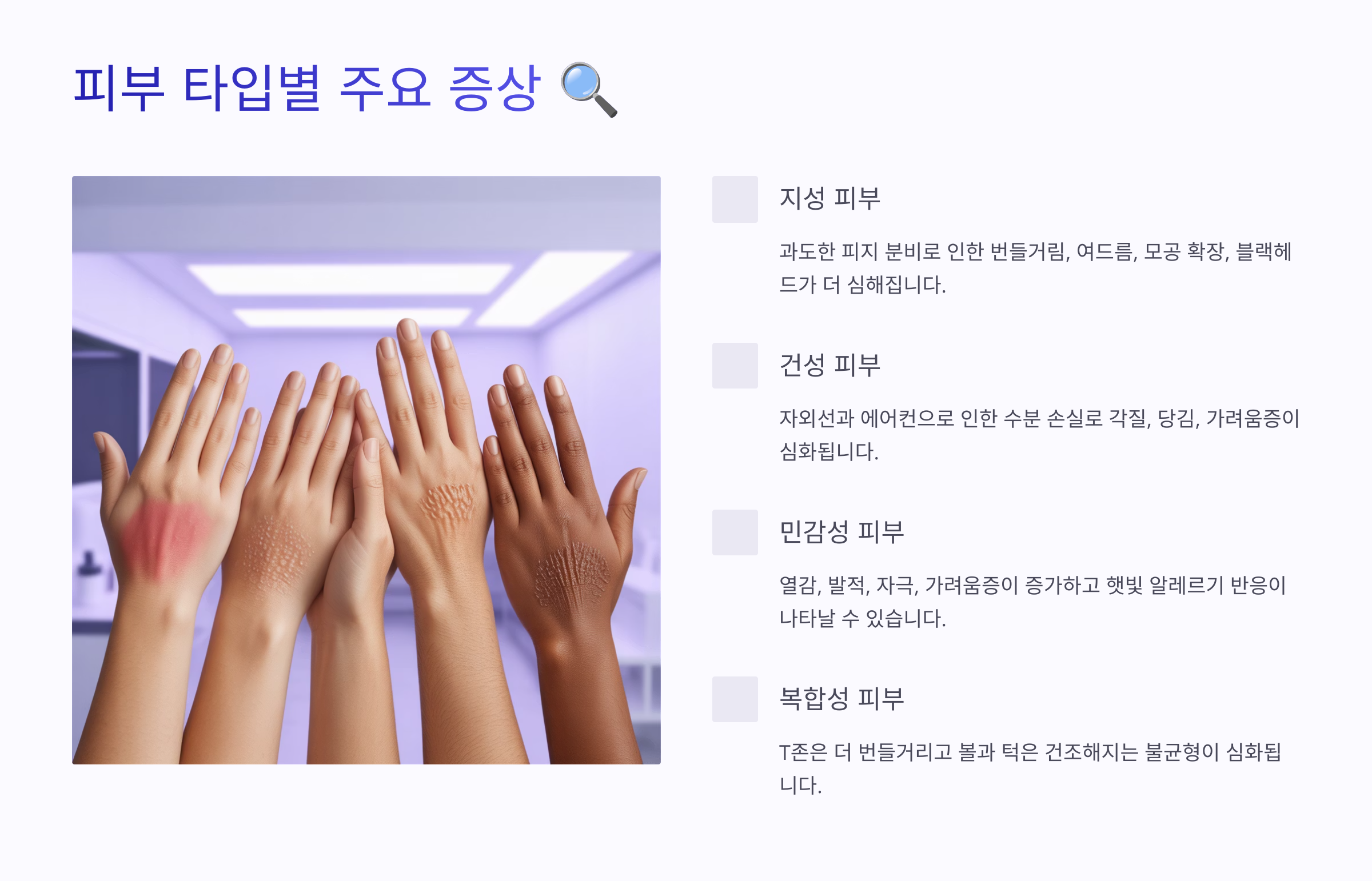 | 피부 타입 | 여름 증상 | 주요 트러블 | 관리 포인트 |