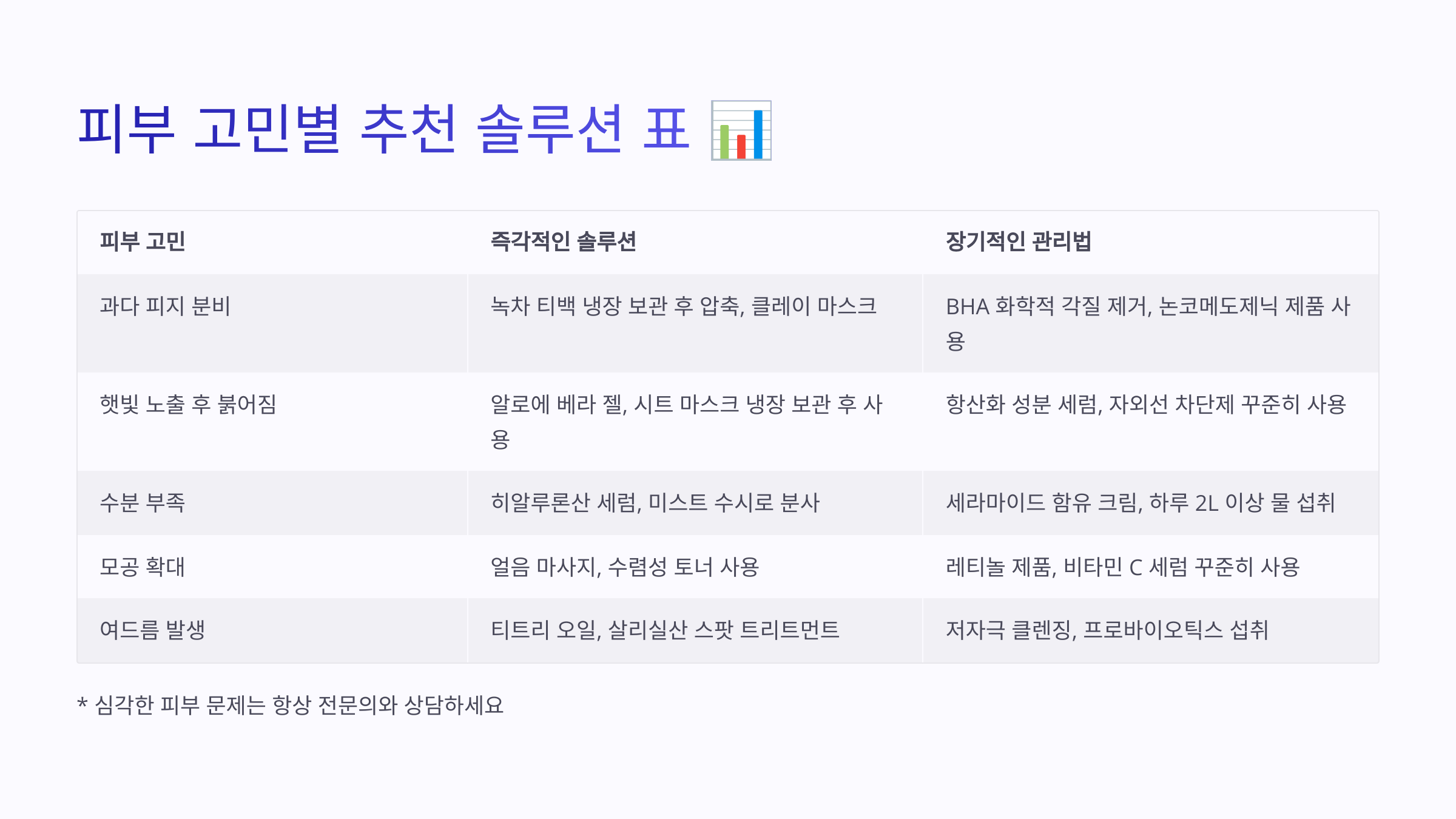 아래에 정리된 표는 가장 흔한 피부 고민별로 어떤 원인에서 시작되고, 어떻게 관리하면 좋은지를 정리해 놓은 솔루션이에요. 간단히 보고 바로 적용할 수 있으니까 꼭 참고해보세요!