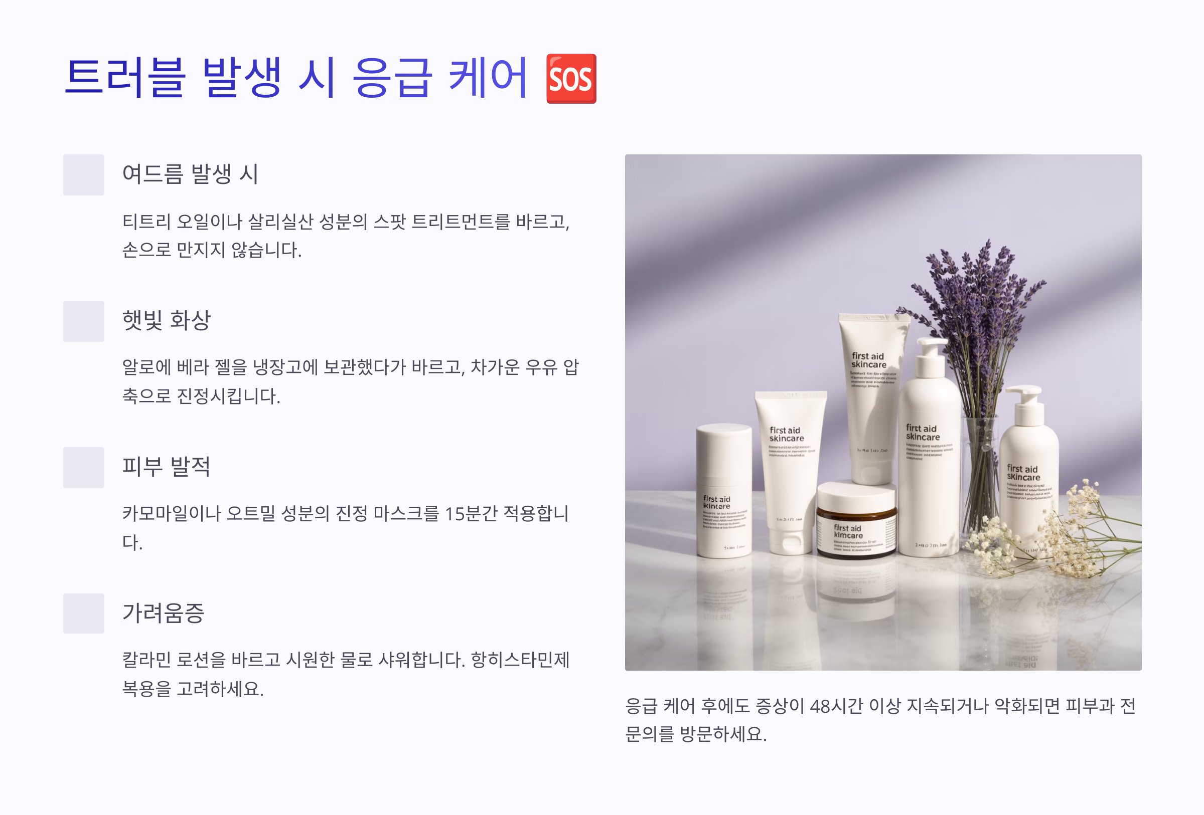 아무리 조심해도 여름엔 트러블이 한번쯤은 생기기 마련이에요. 중요한 건 ‘생겼을 때 어떻게 대처하느냐’에 따라 회복 속도와 흔적이 달라진다는 점이에요. 특히 여름 트러블은 진정과 청결을 동시에 해줘야 악화되지 않아요.