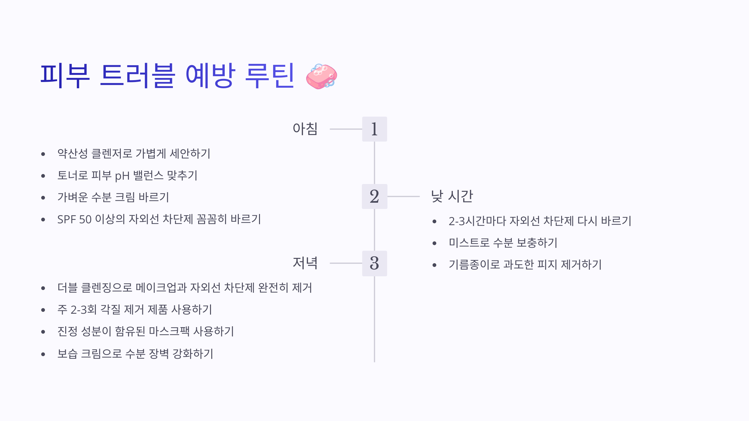 여름철 피부 트러블은 미리 예방하는 것이 최선이에요. 땀과 피지가 많아지는 계절일수록 피부 관리 루틴을 간단하지만 정확하게 갖추는 게 중요해요. 아침과 저녁 루틴만 잘 지켜도 피부가 훨씬 안정될 수 있답니다.