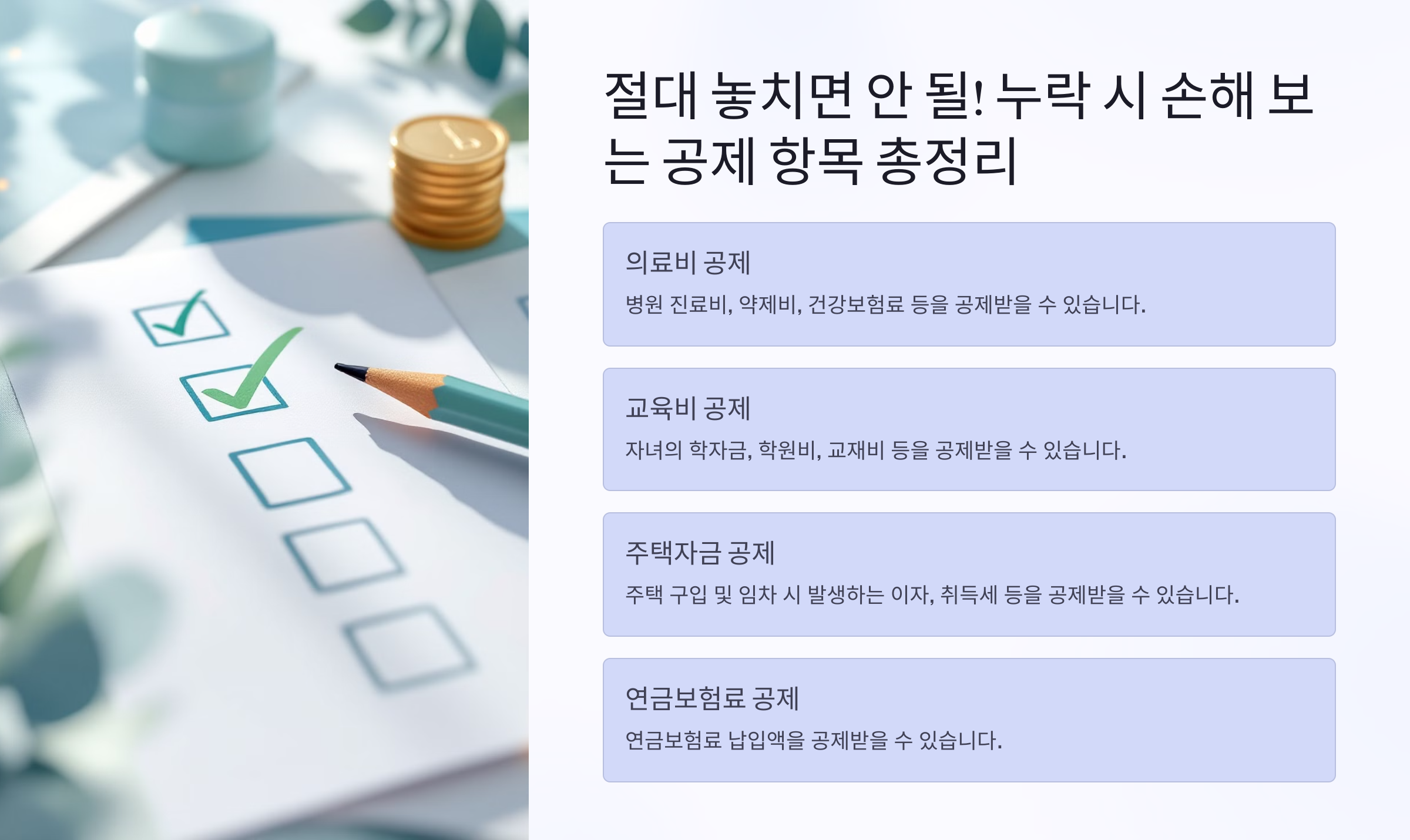 연말정산에서 자주 놓치는 공제 항목이 있어요. 이를 잘 챙기면 추가 공제를 받아 세금을 줄일 수 있답니다.