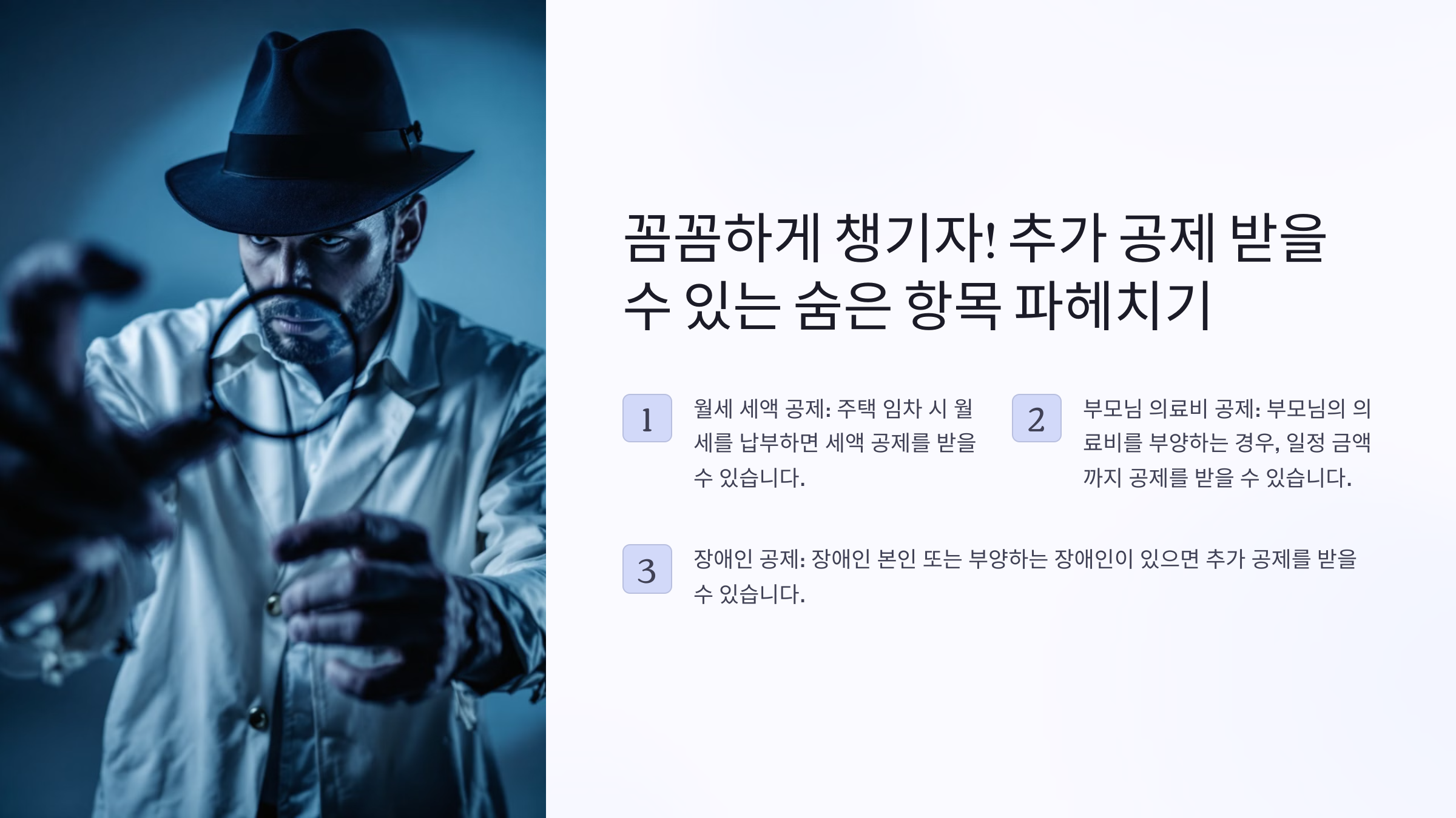 연말정산에는 잘 알려지지 않은 추가 공제 항목이 있어요. 이를 잘 활용하면 더 많은 세금을 돌려받을 수 있답니다.