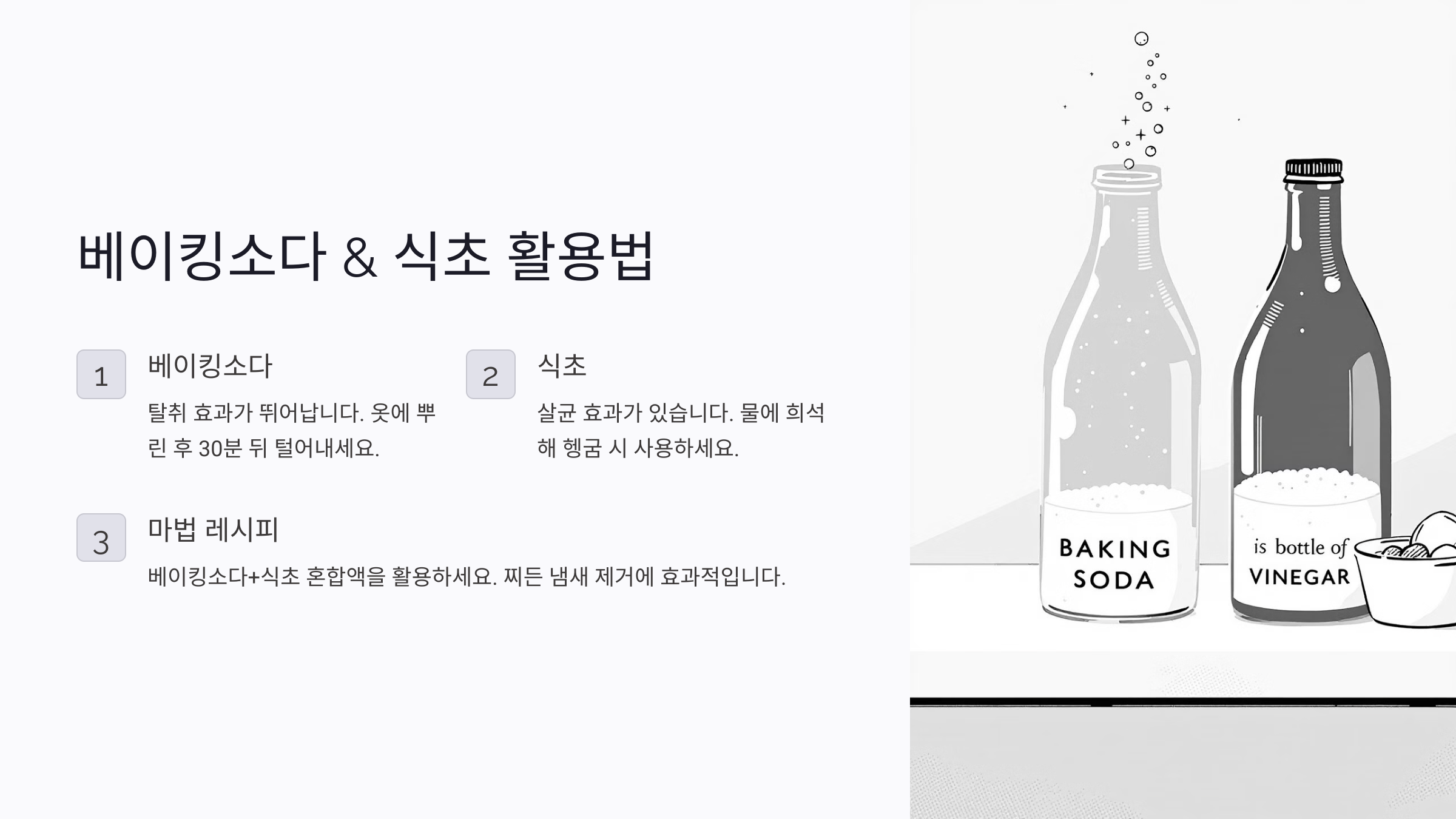 각 냄새에 맞는 세탁법을 활용하면 훨씬 효과적으로 냄새를 없앨 수 있어요! 다음은 베이킹소다와 식초를 활용한 추가 팁을 알아볼까요?