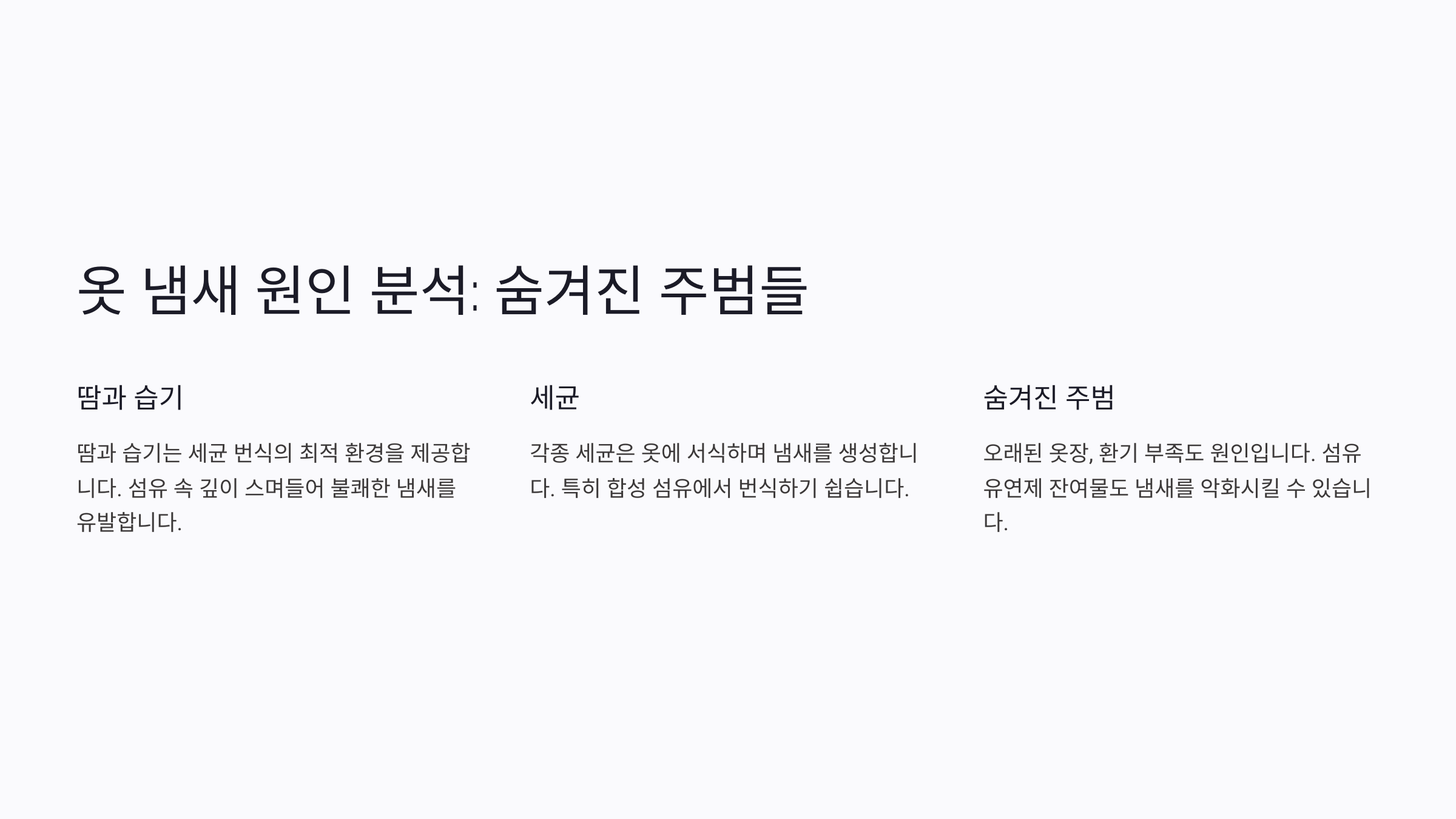 | 곰팡이 냄새 | 습기와 세균 번식 | 햇볕 건조, 세탁 후 완전 건조 |
