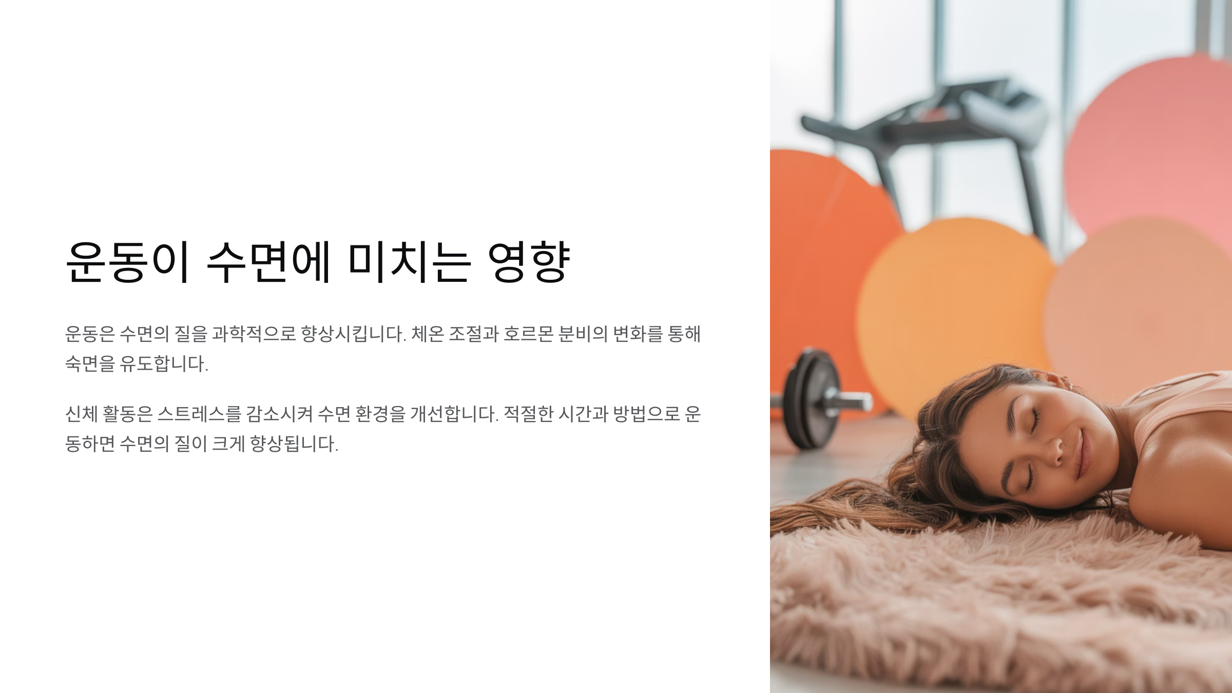 또한, 운동은 체온을 일시적으로 상승시켰다가 운동 후에는 자연스럽게 체온이 떨어지는데, 이 체온 변화가 수면 유도에 아주 중요한 역할을 해요. 체온이 내려가면서 뇌는 "이제 잘 시간이야"라고 인식하게 되는 거예요.