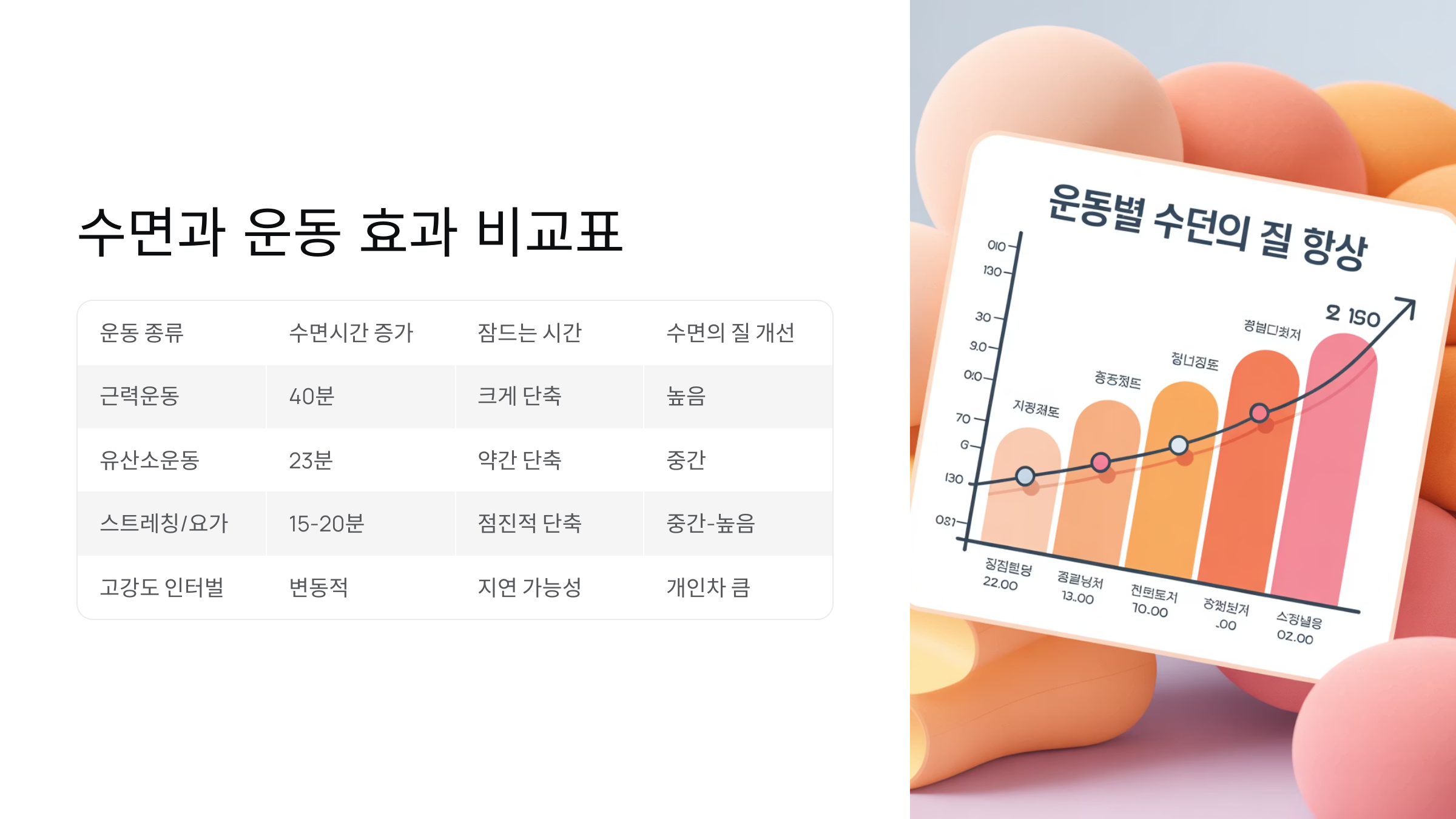 운동은 목적에 따라 선택하고, 수면 목표에 맞춰 시간과 강도를 조절하는 게 가장 좋아요. 무리 없이, 나에게 맞는 운동을 매일의 수면 루틴에 넣어보세요 😊