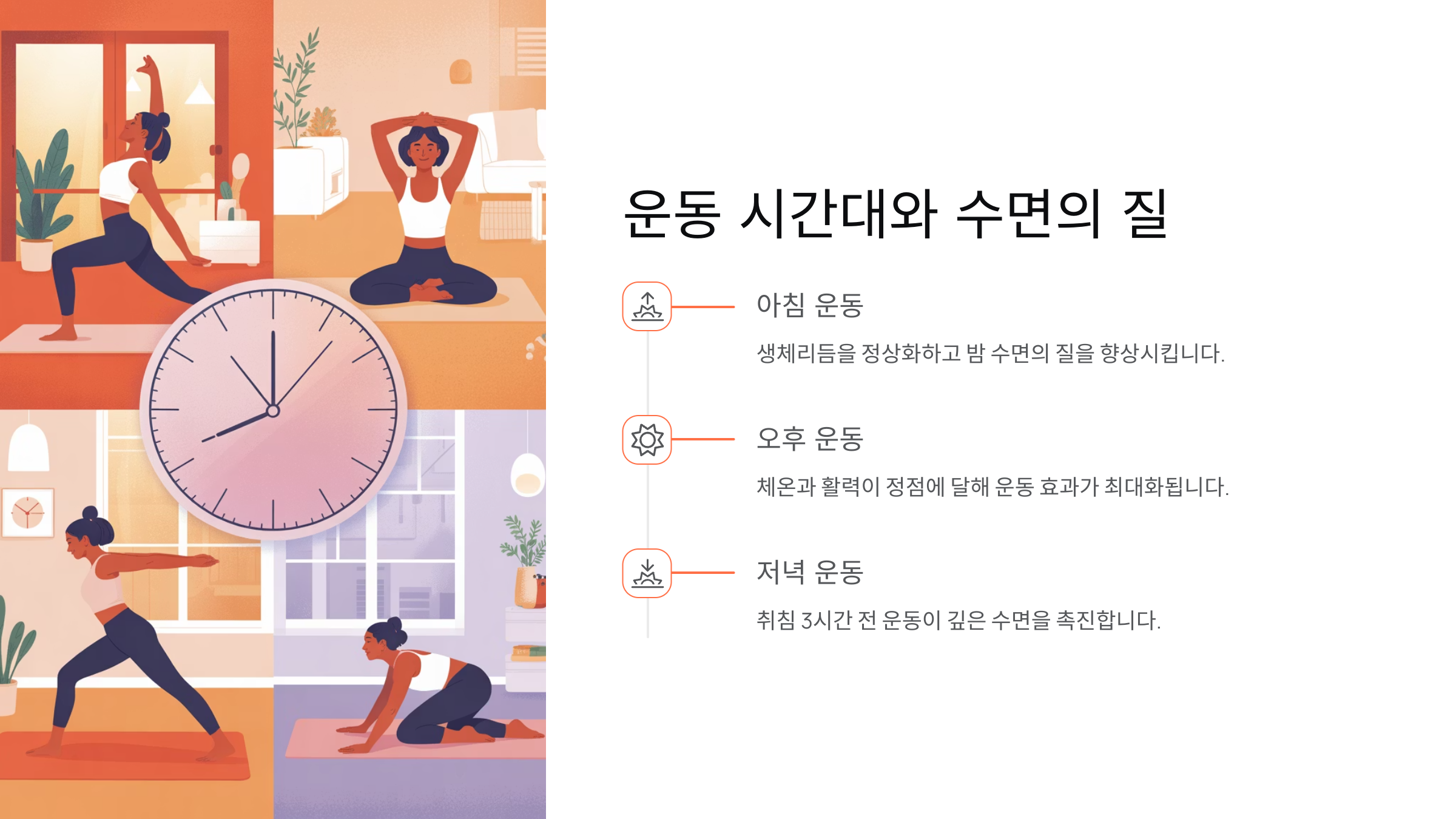 운동이 수면에 좋은 건 분명하지만, 운동을 언제 하느냐에 따라 수면의 질은 천차만별로 달라져요. 일반적으로는 아침과 저녁 운동 모두 장단점이 있어요. 핵심은 자기 몸에 맞는 시간을 찾는 거예요.
