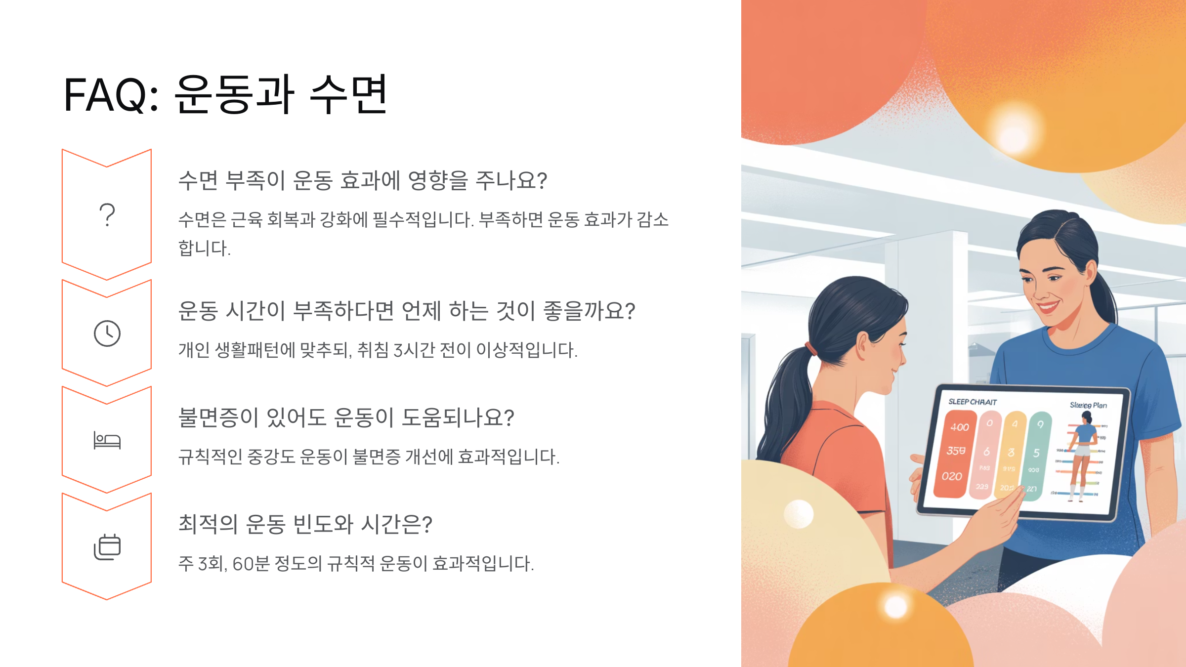 정리하자면, 운동은 뇌 화학물질, 체온, 호르몬, 심리 상태까지 총체적으로 조절하면서 수면을 돕는 완전한 천연 수면제라고 할 수 있어요. 단, 아무 때나, 아무 운동이나 해선 안 된다는 사실도 꼭 알아야 해요!