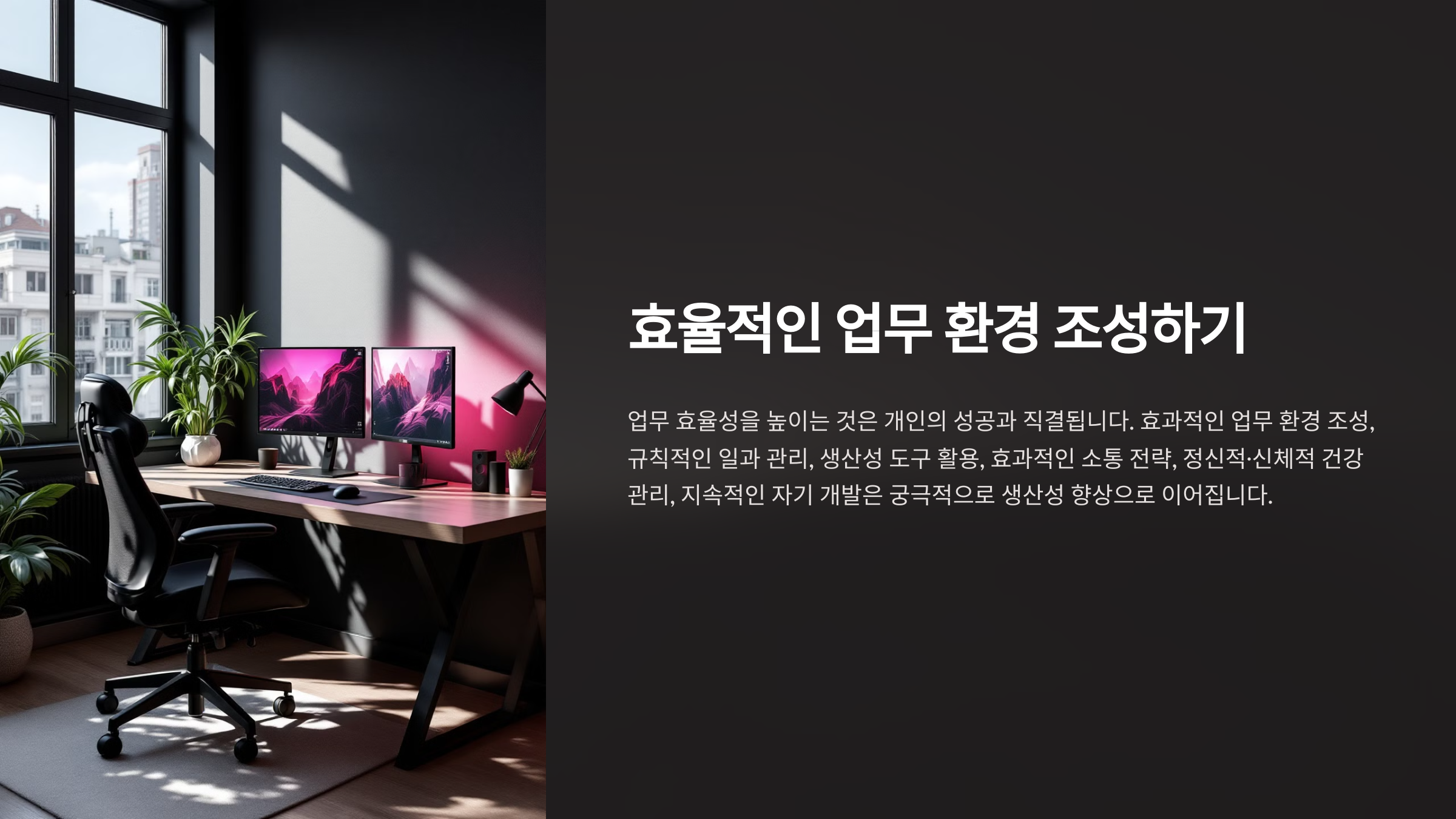 A5. 깔끔한 책상, 편안한 의자, 그리고 자연광 활용이 중요한 요소예요. 업무에 필요한 최소한의 물건만 배치하세요.