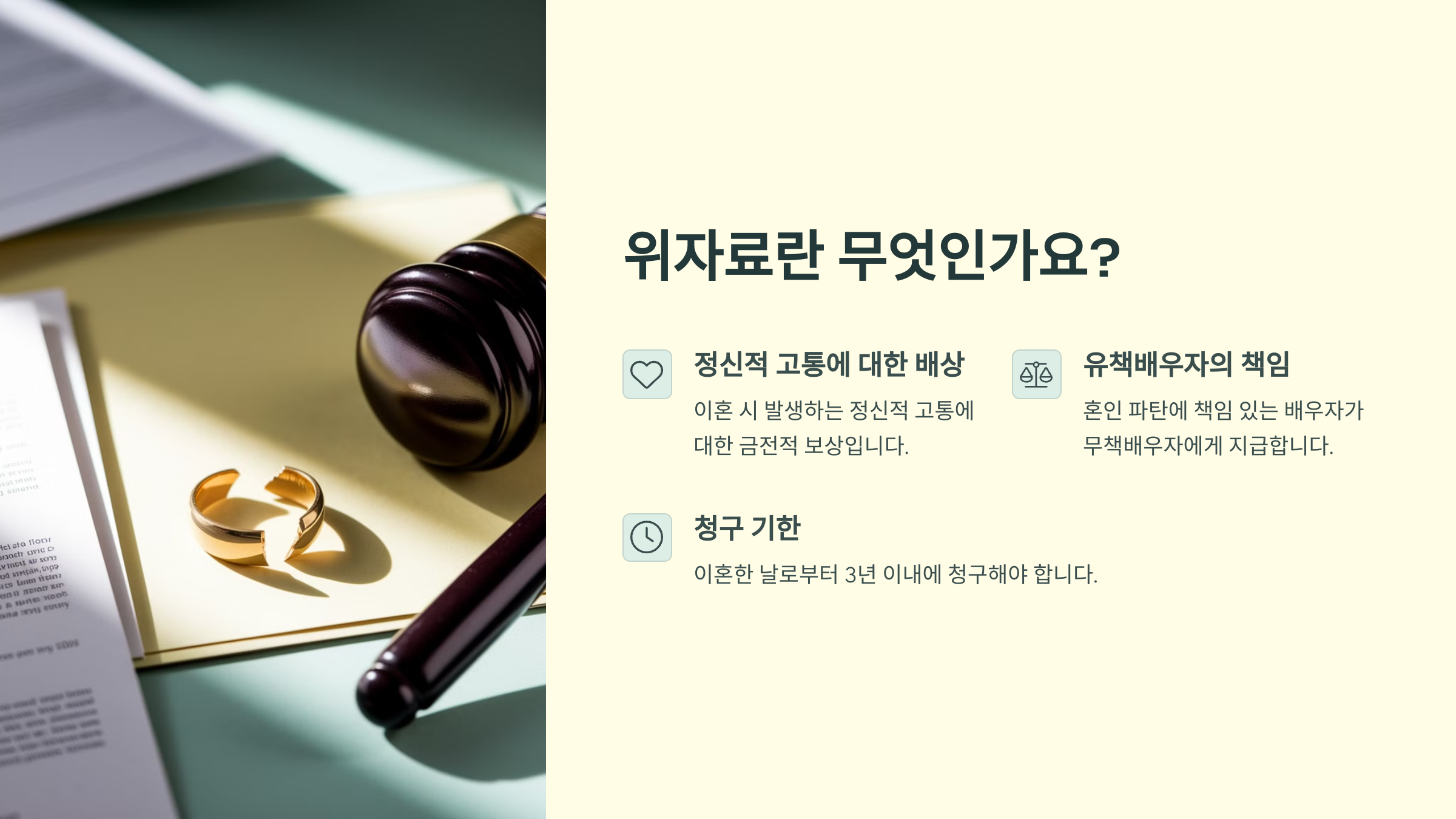위자료는 정신적인 고통에 대해 상대방에게 청구하는 배상금이에요. 보통 외도, 폭력, 유기 등 명백한 잘못이 있는 경우 청구할 수 있어요.