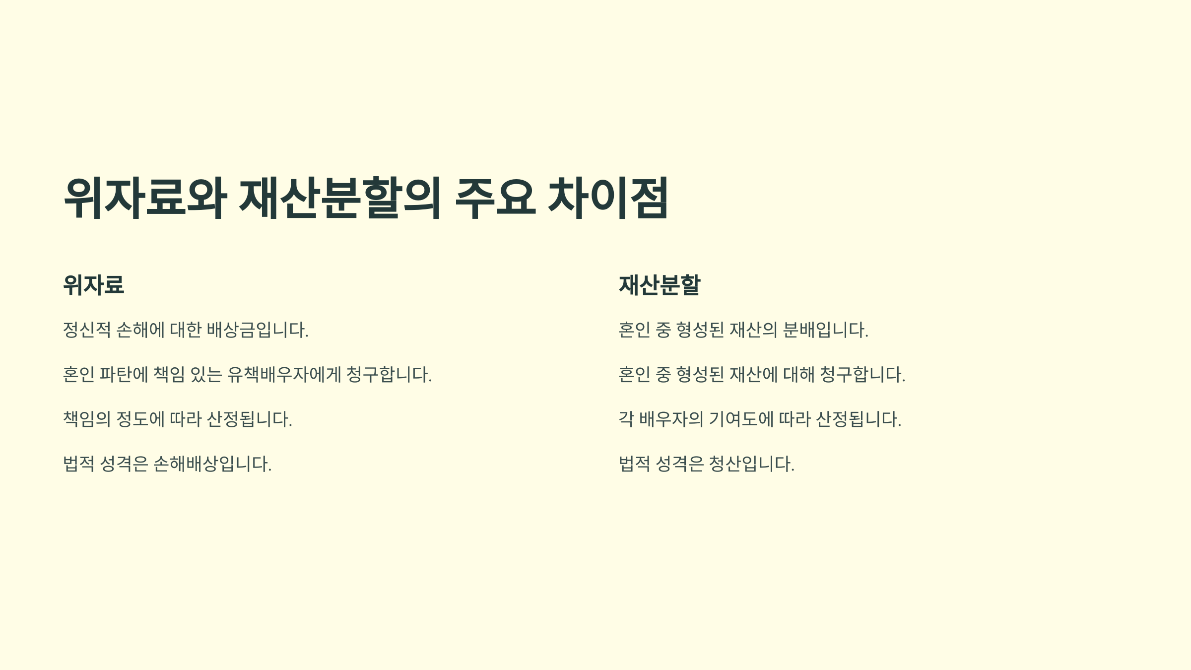 위자료는 "정신적 피해 보상", 재산분할은 "경제적 분배"라는 점이 핵심이에요. 이 두 제도는 전혀 다른 목적과 법적 기준을 가지고 있어요.