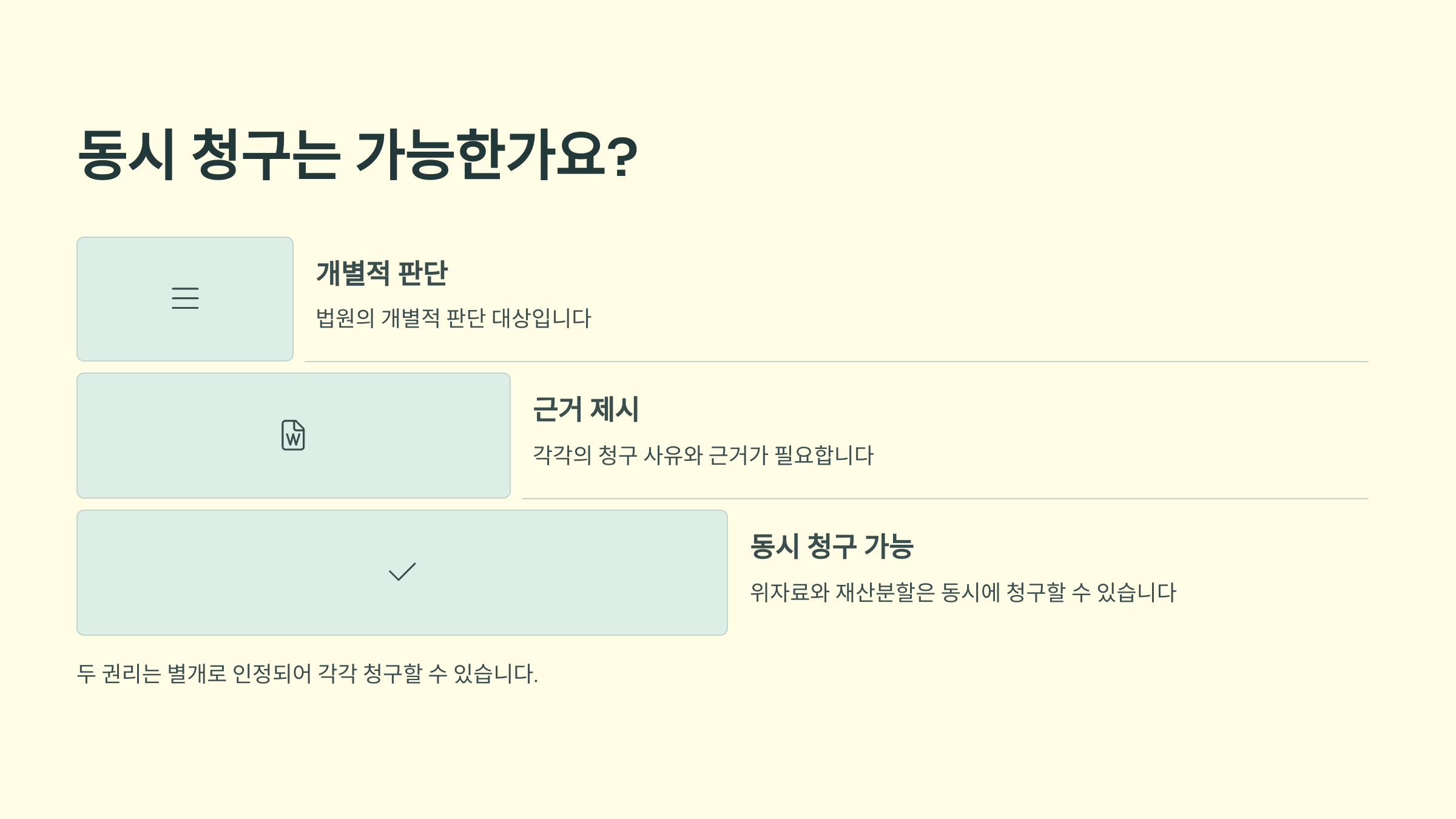 네, 위자료와 재산분할은 동시에 청구할 수 있어요. 같은 이혼 소송에서 두 가지를 한꺼번에 요구해도 법적으로 문제 없어요.
