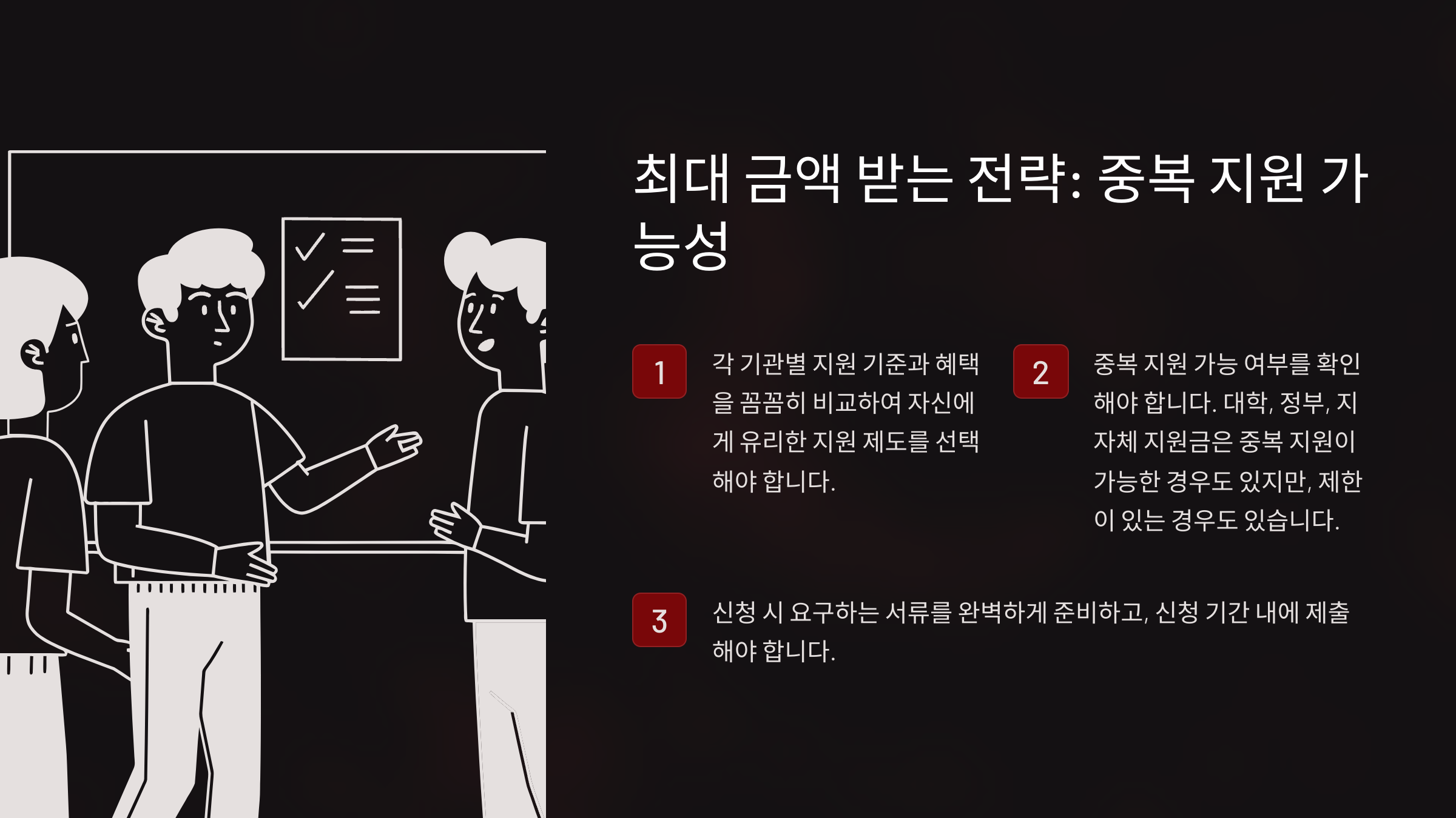 입학지원금은 여러 기관에서 제공되기 때문에 전략적으로 신청하면 더 많은 금액을 받을 수 있어요. 중요한 건 중복 지원이 가능한 경우와 아닌 경우를 구분하는 것이에요. 정부 지원금과 대학 또는 지자체 지원금은 일부 중복 지원이 가능하지만, 동일한 항목(등록금 등)에 대한 중복 지원은 제한될 수 있어요.