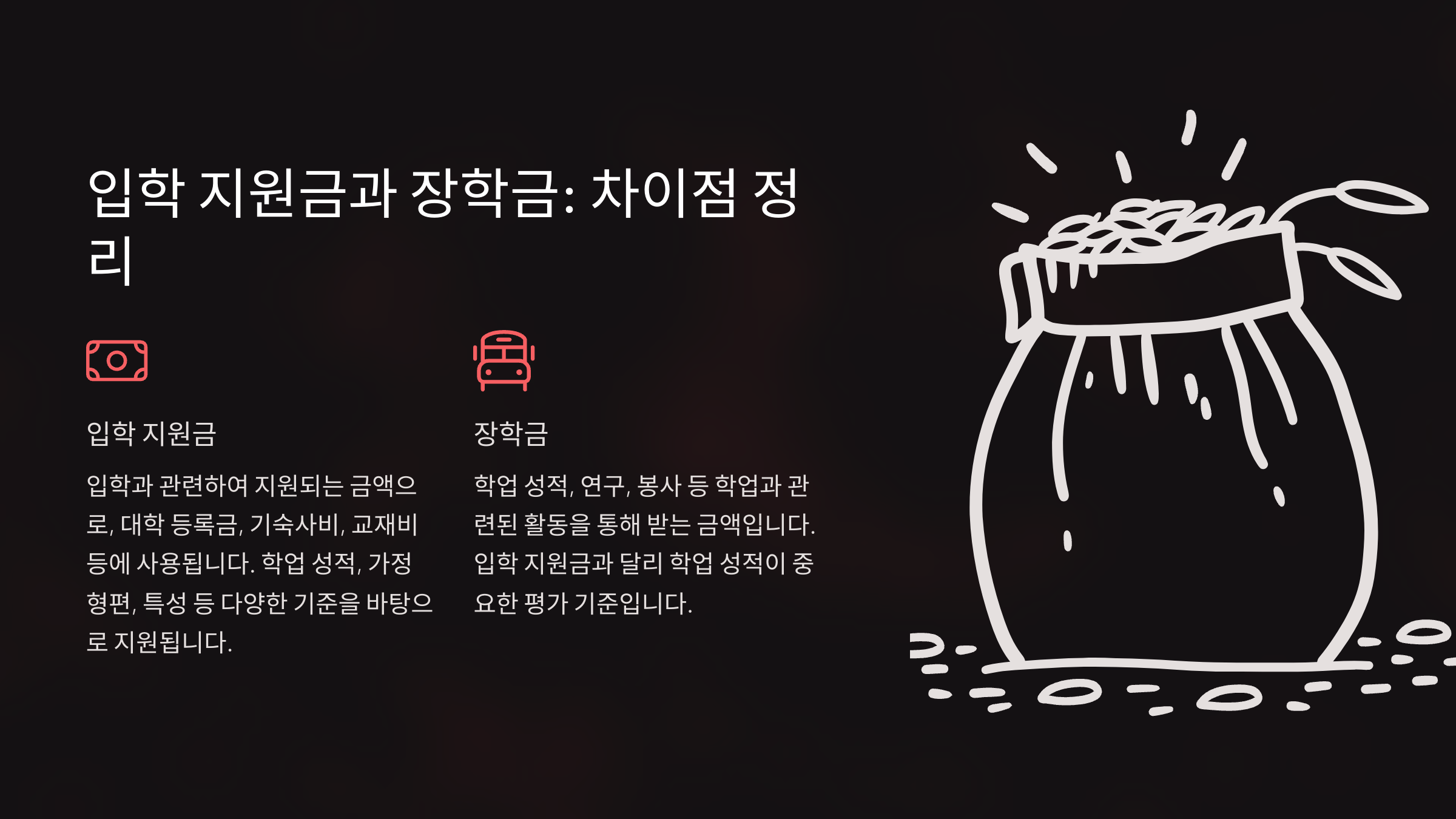 입학지원금과 장학금은 모두 학생들에게 재정적 도움을 주는 제도이지만, 지원 목적과 지급 기준이 다를 수 있어요. 입학지원금은 주로 경제적 어려움을 겪는 학생들을 대상으로 지급되며, 장학금은 성적 우수자나 특정 조건을 충족하는 학생들에게 지급되는 경우가 많아요.
