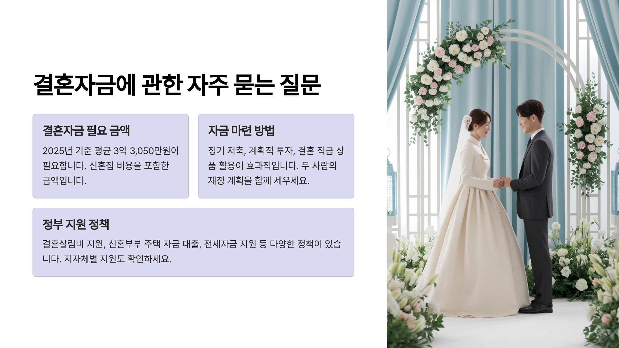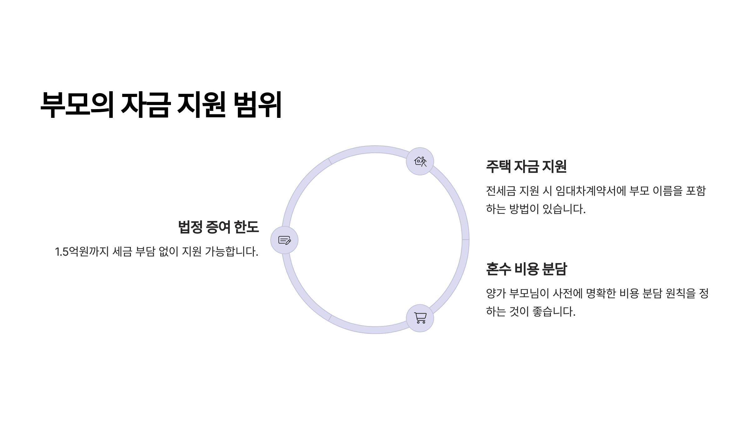 그래서 부모가 할 수 있는 지원은 전체 결혼 비용 중 일부, 특히 예식 비용이나 혼수 비용으로 한정하는 것이 좋아요. 주택 지원은 자녀 부부가 함께 준비하는 것이 이상적이에요.