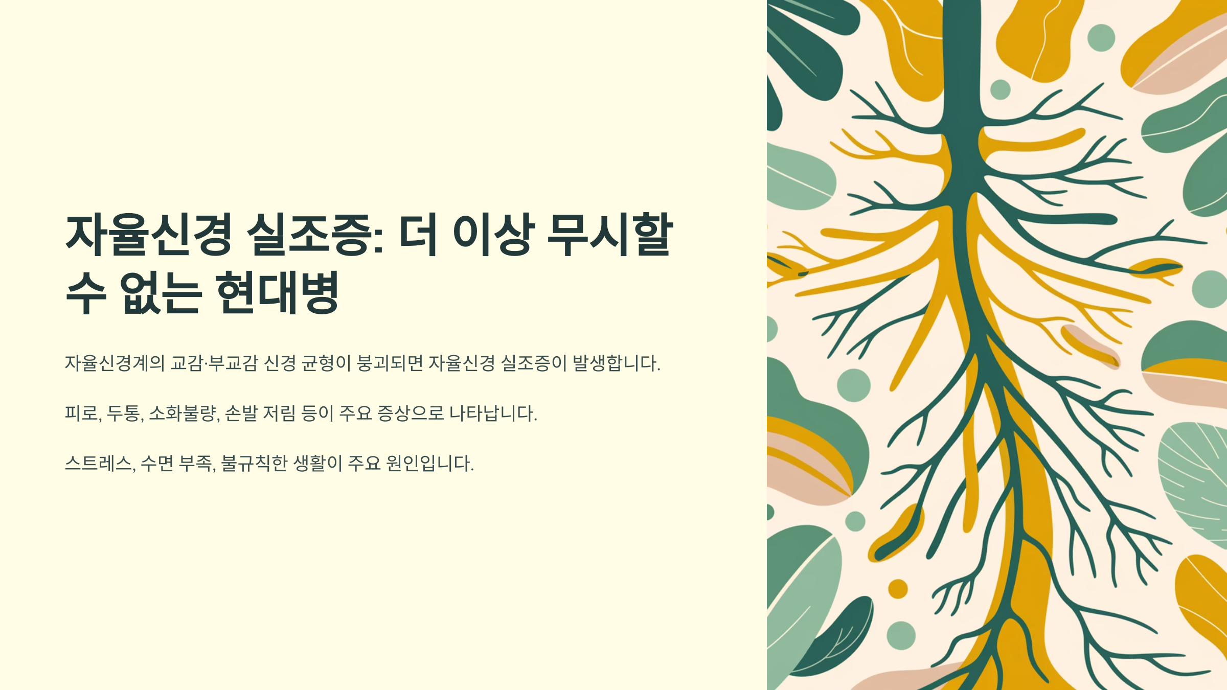 자율신경 실조증은 우리 몸의 신경계 중에서도 '자율신경계'가 제 기능을 하지 못하고 균형이 깨진 상태를 말해요. 자율신경계는 교감신경과 부교감신경으로 나뉘는데, 이 둘이 균형을 맞추며 체온, 심박수, 혈압, 소화 등 생명 유지 기능을 자동으로 조절해요.