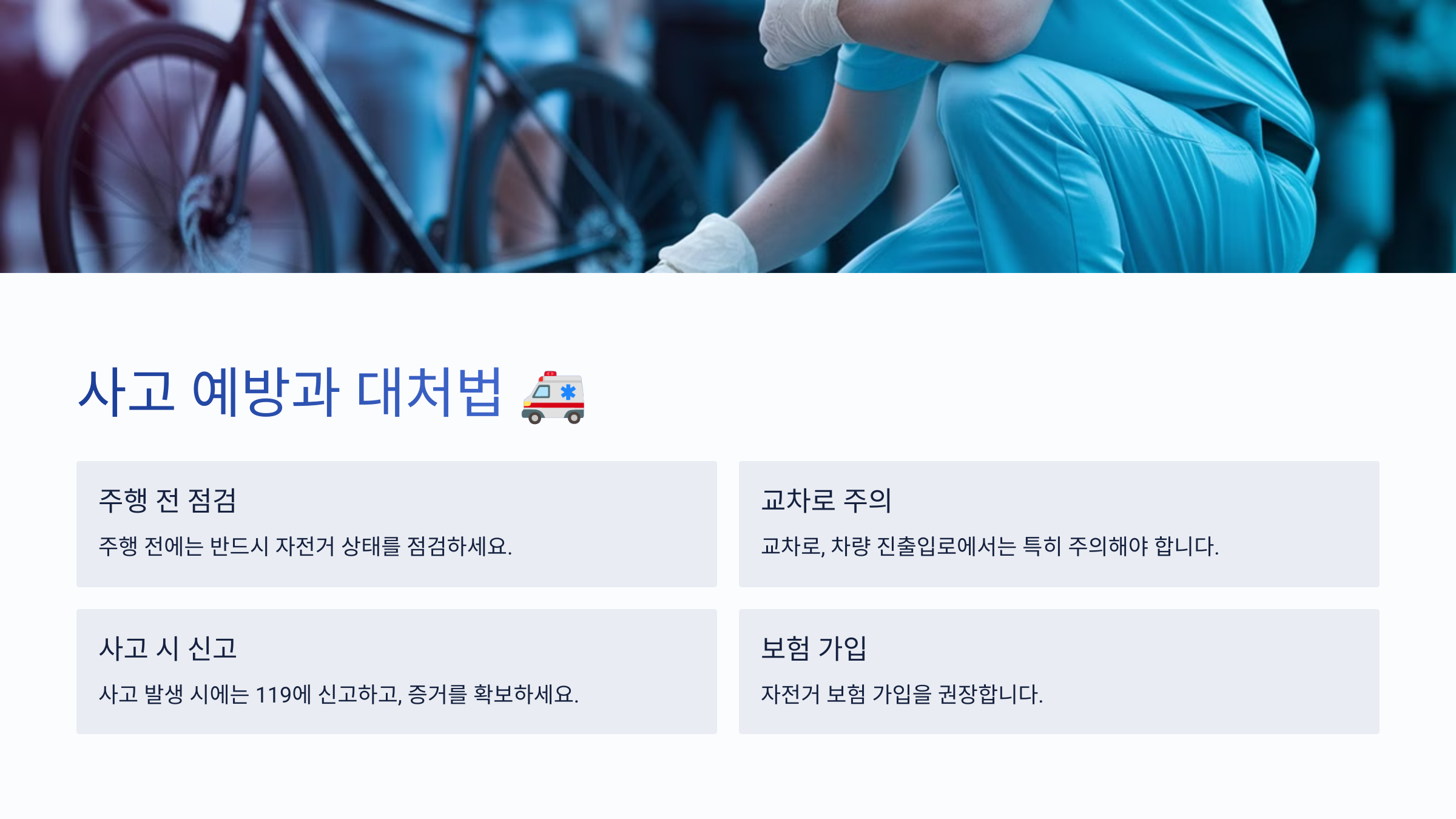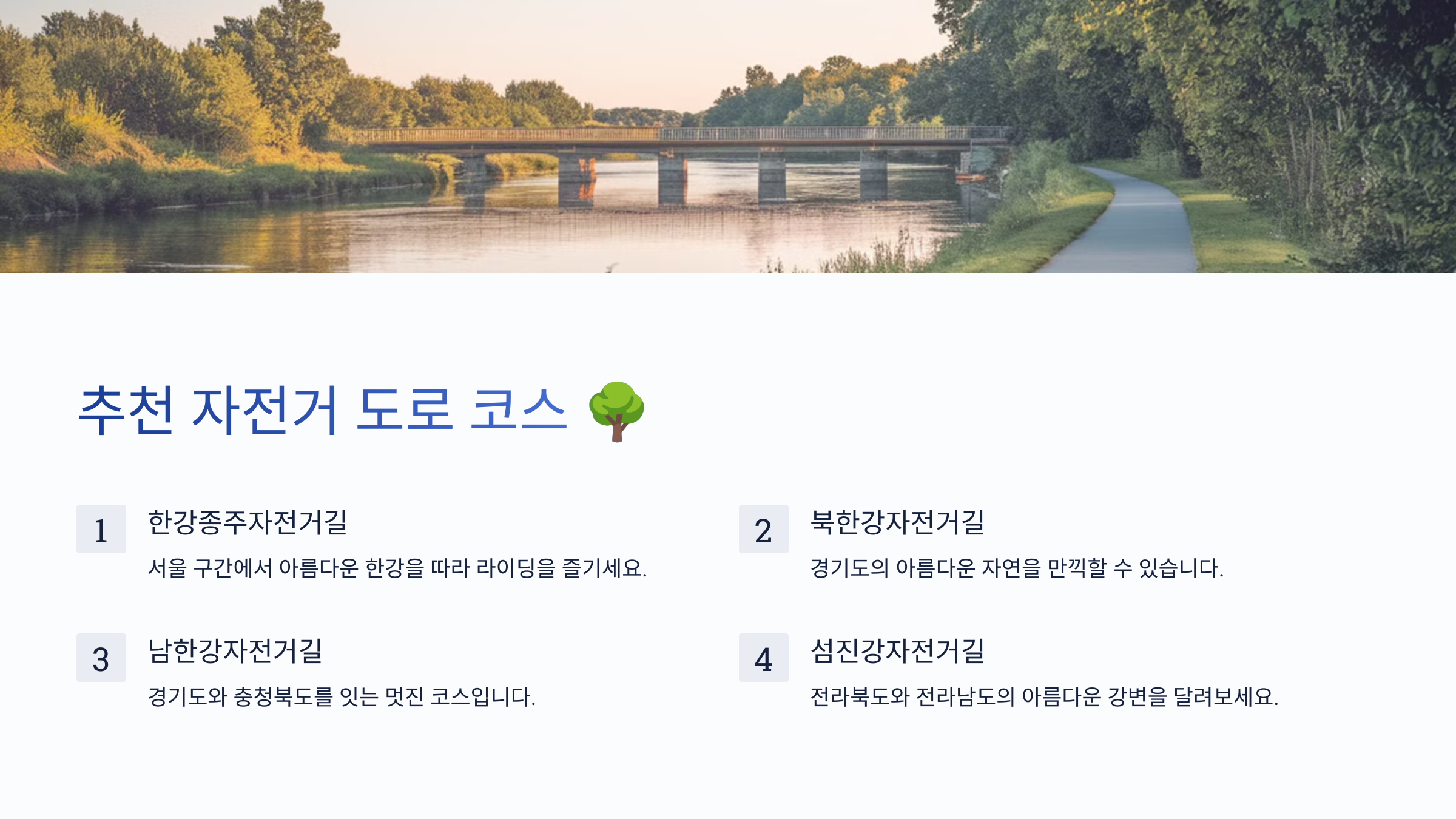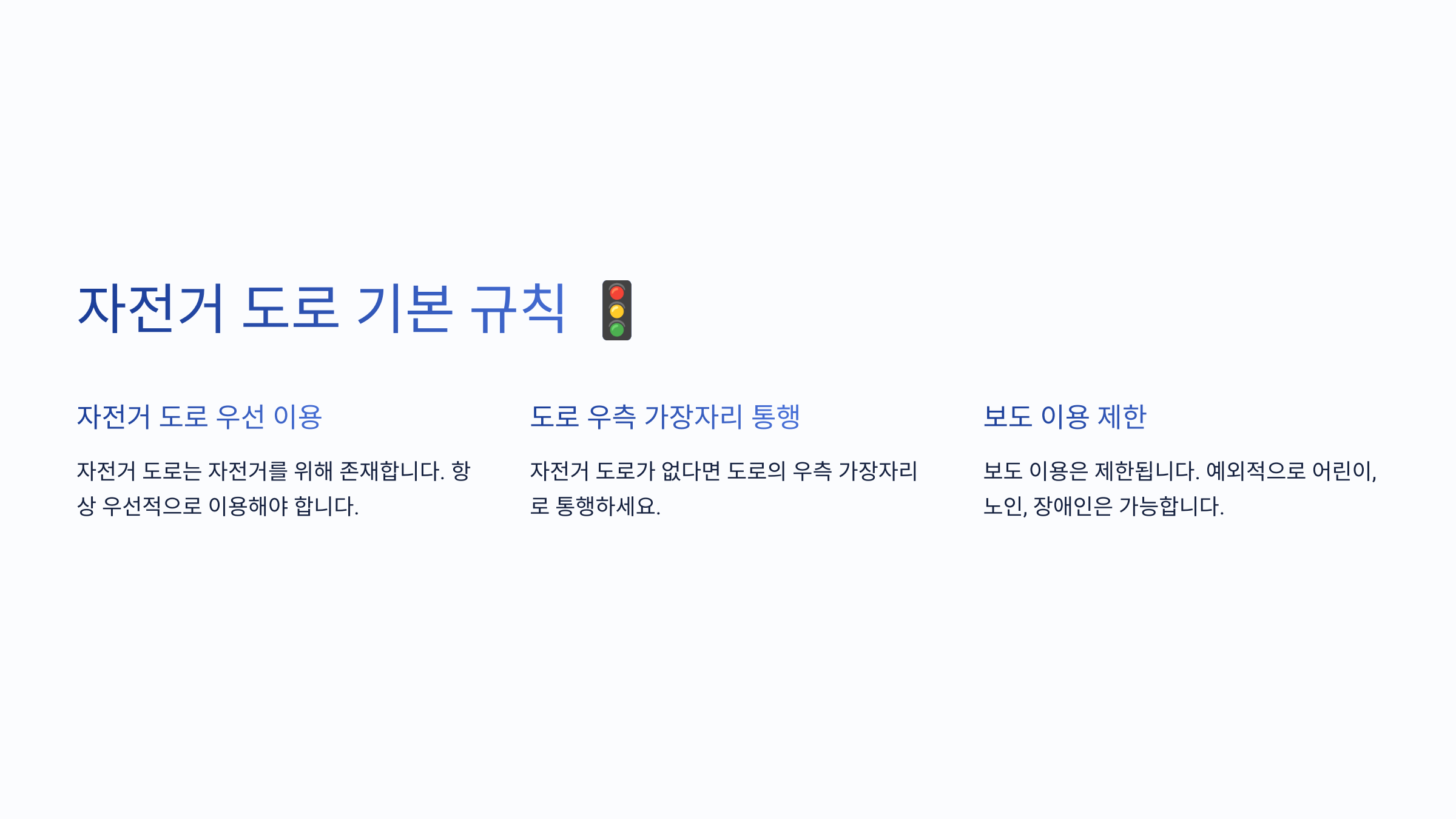 그럼 지금부터 자전거 도로 이용법에 대한 모든 정보를 박스 형태로 나눠서 천천히 안내할게요. 자동으로 다음 섹션으로 이어지니 걱정하지 마세요!