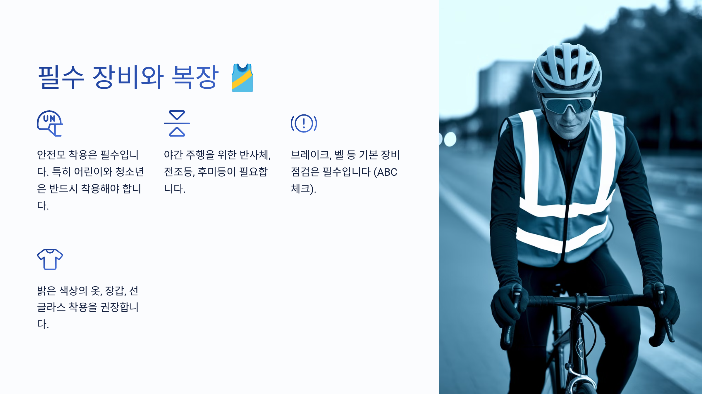 자전거를 탈 때는 안전을 위한 장비와 편안한 복장이 정말 중요해요. 아무리 규칙과 예절을 잘 지켜도, 기본 장비가 없으면 큰 사고로 이어질 수 있거든요. 그럼 자전거 도로를 달릴 때 꼭 필요한 아이템들을 하나씩 소개할게요! 🚲