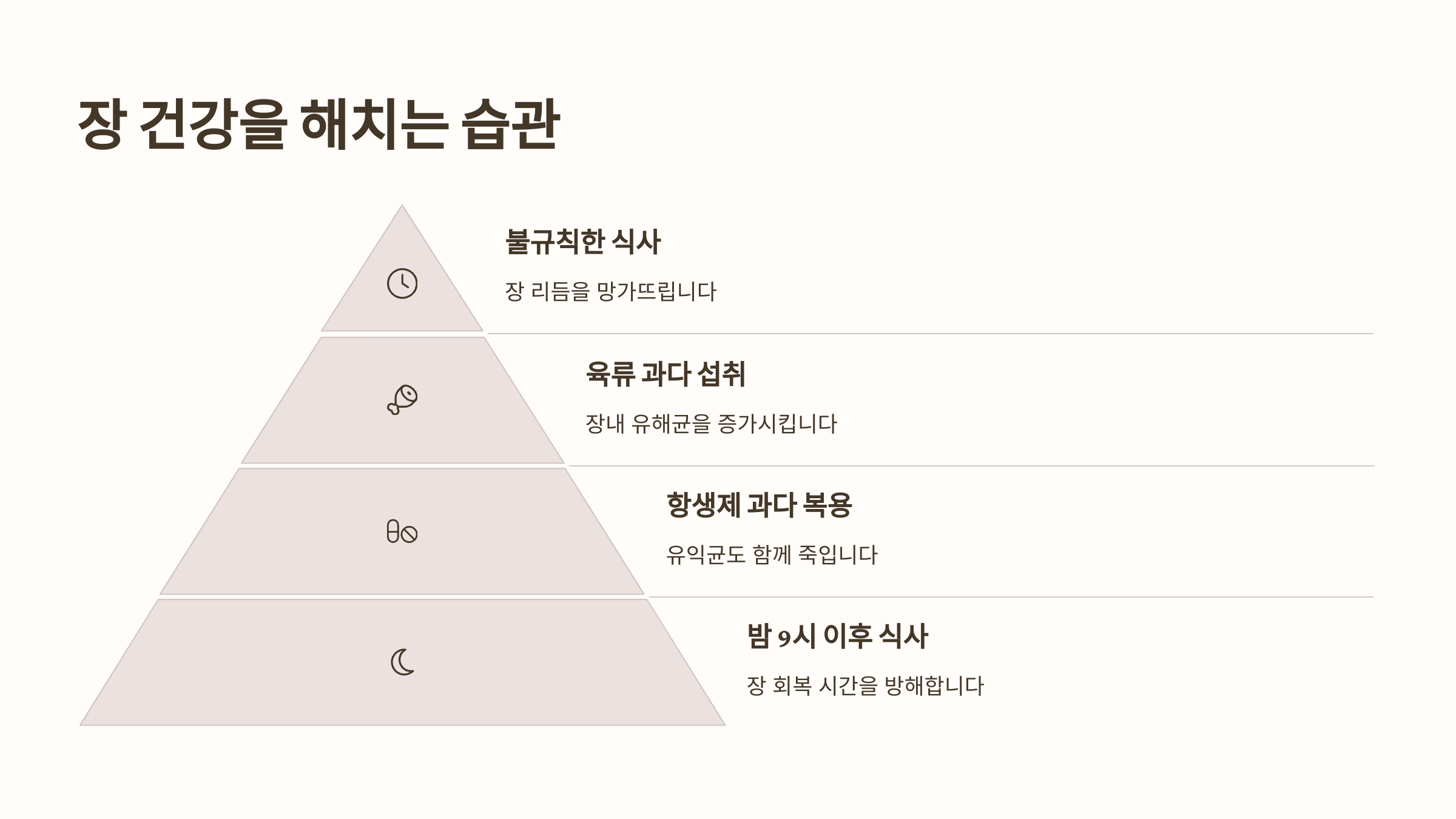 장이 민감한 사람일수록 이런 습관이 바로 증상으로 나타나기 쉬워요. 생활 패턴부터 점검해보는 게 장 건강의 시작이에요.