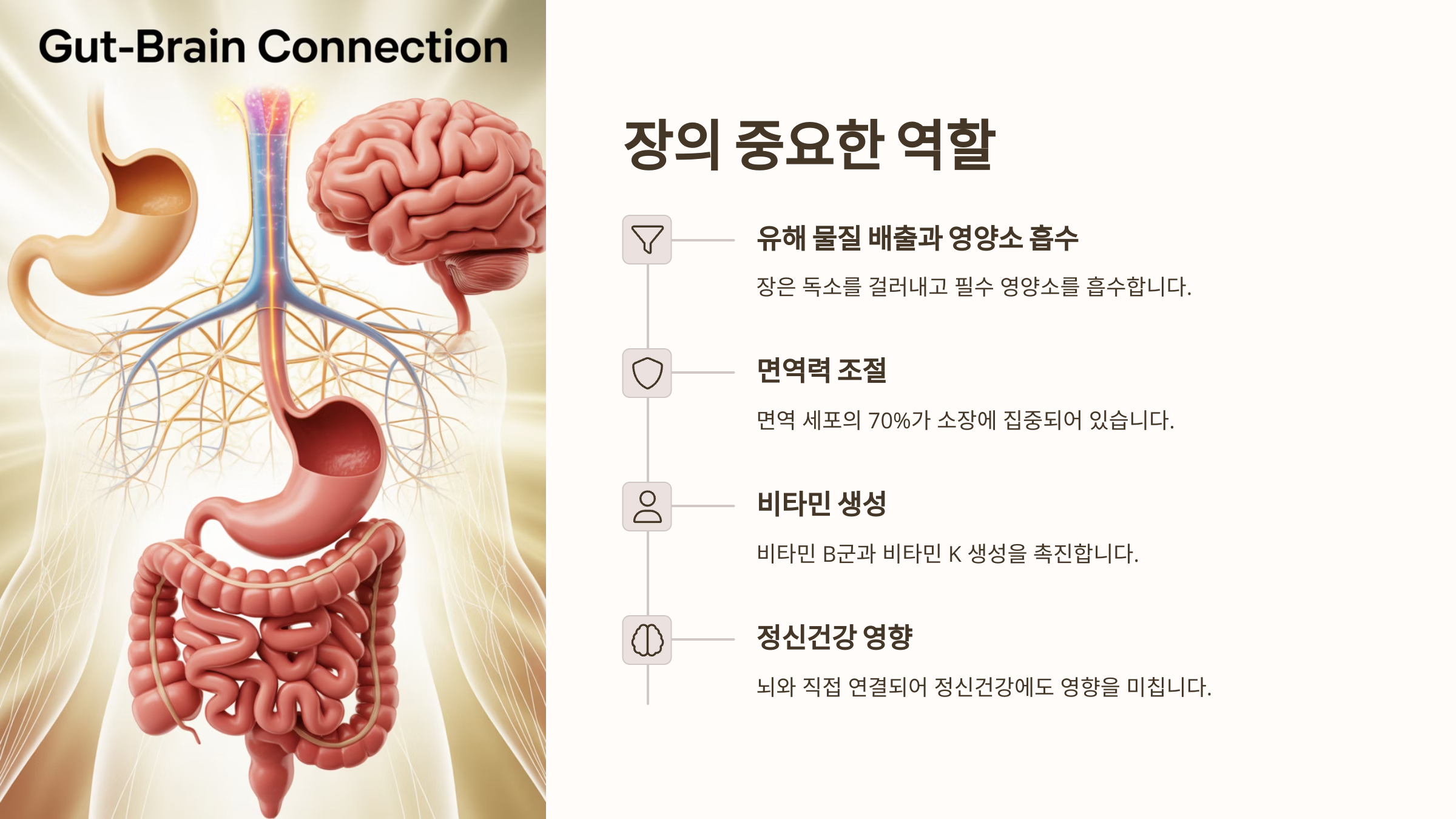 장은 단순히 음식을 소화시키는 기관이 아니에요. 영양소를 흡수하고, 노폐물을 배출하며, 면역 기능의 70%를 담당하는 아주 중요한 기관이에요. 우리 몸의 '두 번째 뇌'라고도 불릴 정도로 감정과도 밀접하게 연결돼 있어요.