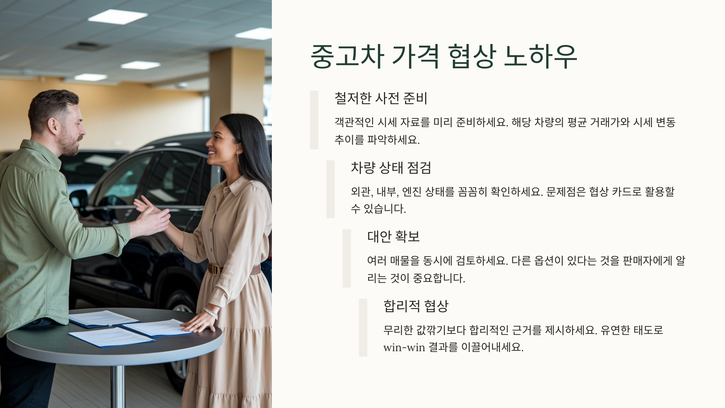 중고차를 구매할 때 가격 협상을 잘하면 최대 수십만 원까지 아낄 수 있어요! 💰