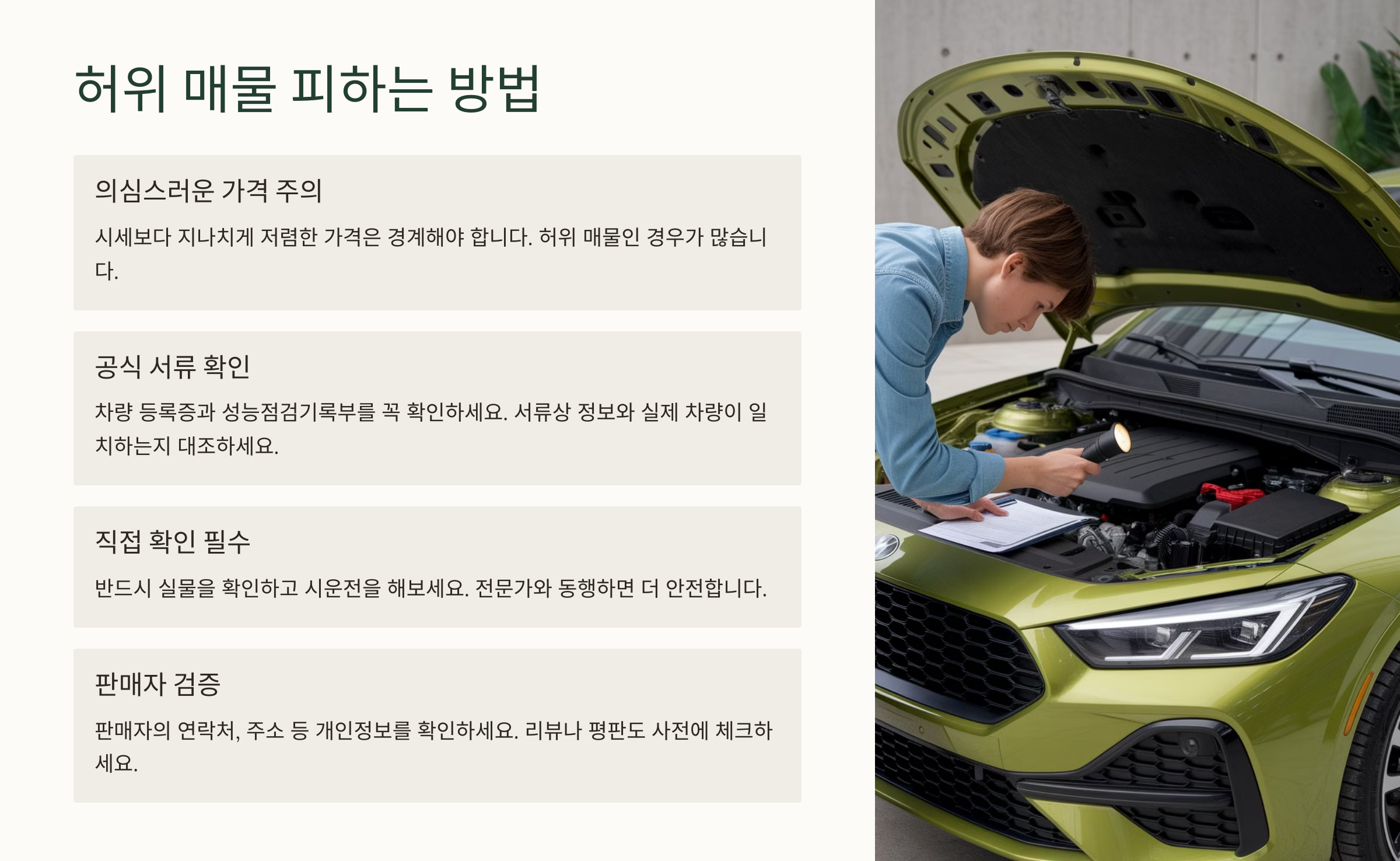 중고차 거래에서 허위 매물에 속지 않으려면 몇 가지 체크해야 할 사항이 있어요! 🚗⚠️