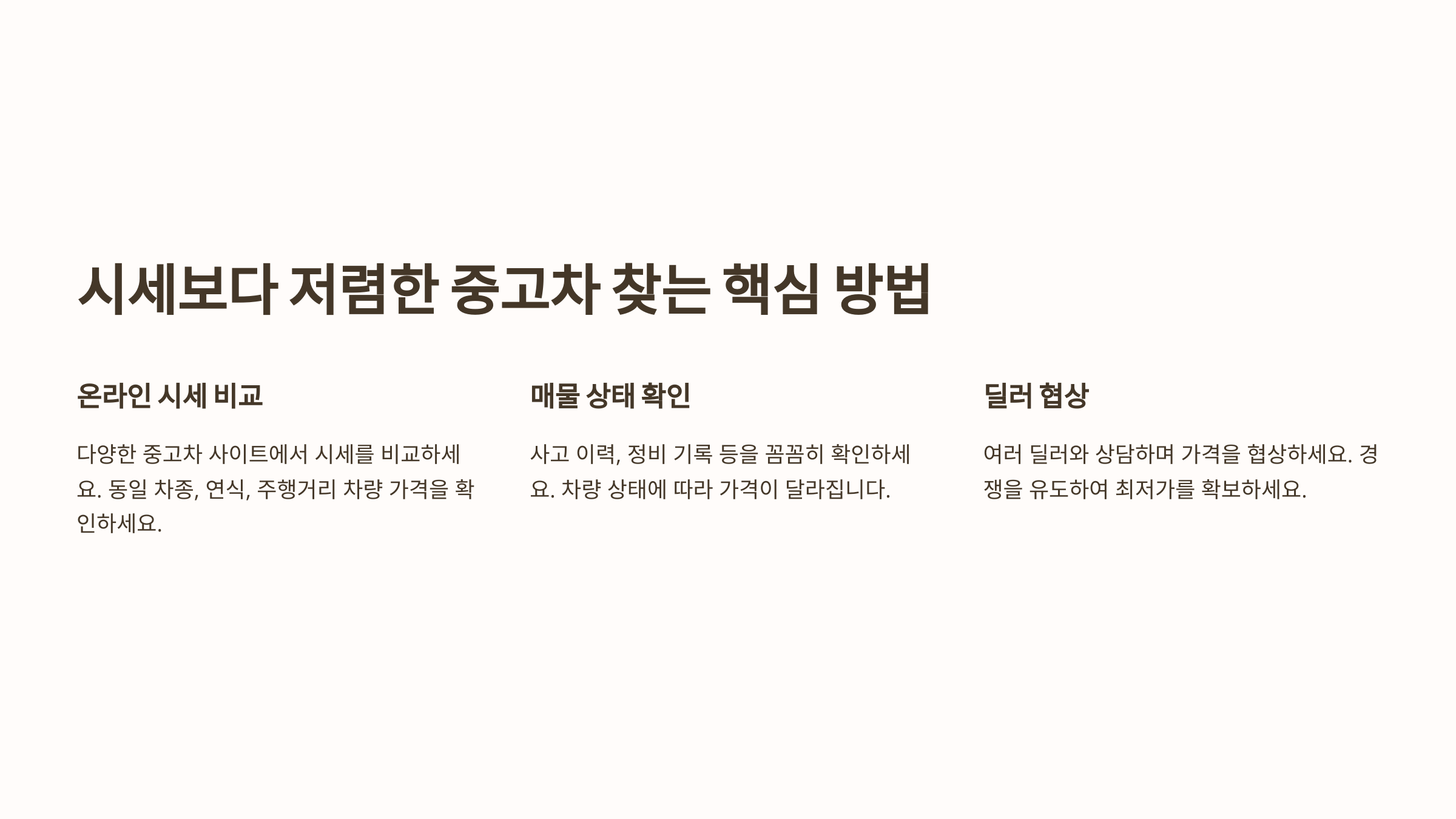 | 급매물 노리기 | 개인 사정으로 급하게 파는 차는 저렴한 경우가 많음 |