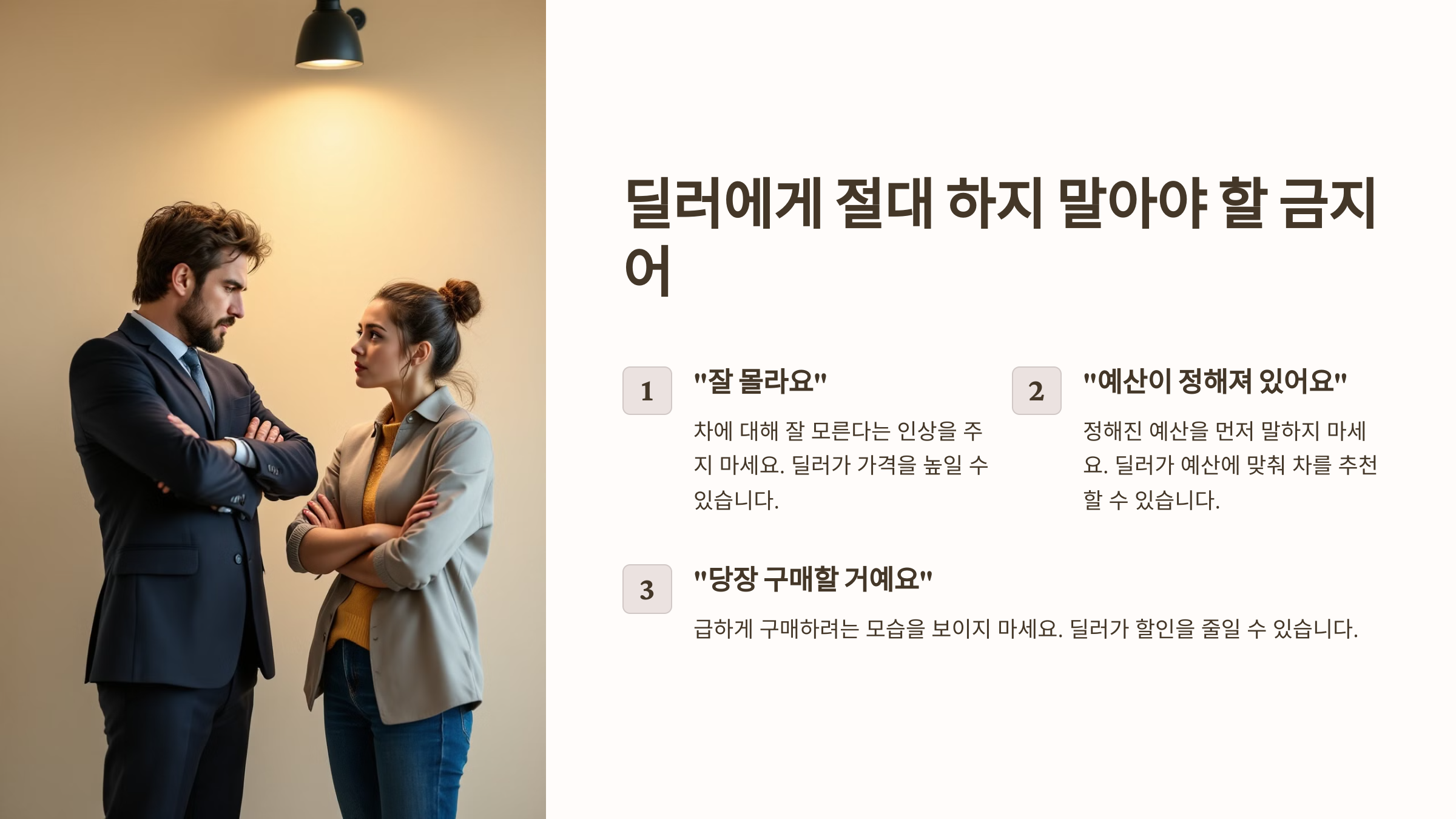 위 방법을 활용하면 시세보다 저렴한 차량을 찾을 확률이 높아져요. 하지만, 딜러와 협상할 때 절대 하면 안 되는 말이 있어요. 다음 섹션에서 꼭 피해야 할 말들을 알려줄게요!