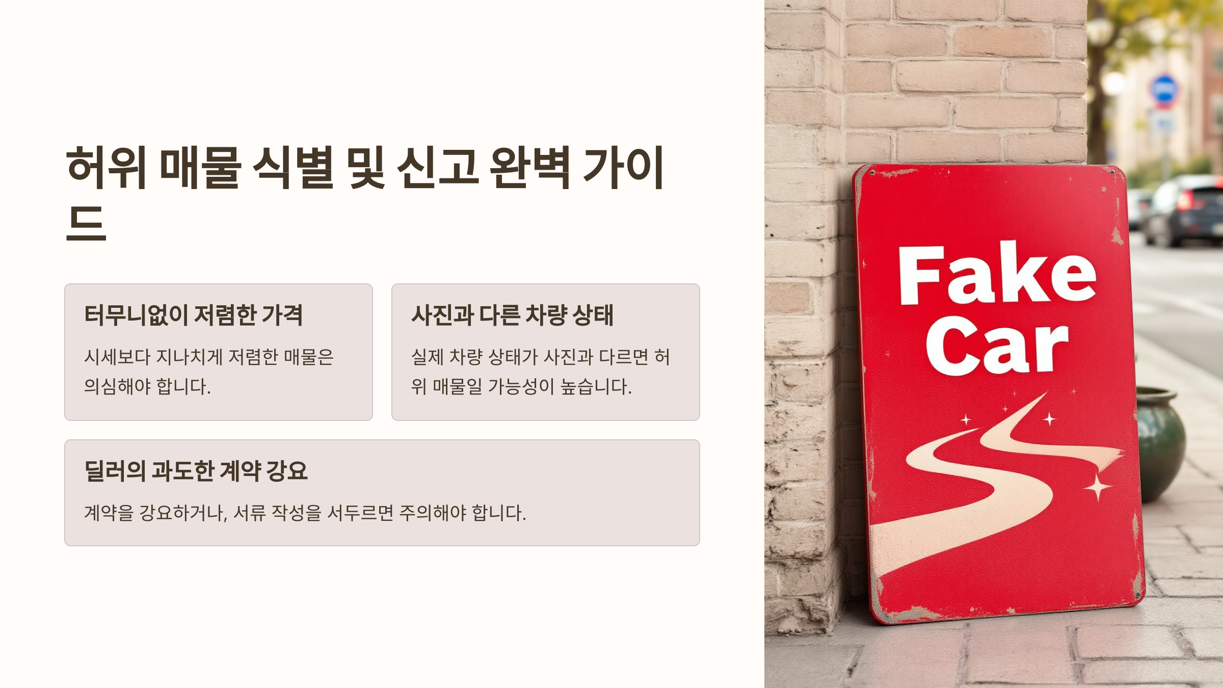 🚨 중고차 시장에서 가장 조심해야 할 것이 바로 허위 매물이에요. 인터넷에서 "최저가! 300만 원 할인!" 같은 광고를 보고 갔다가 실제로는 그런 차가 없거나, 더 비싼 차를 강요당하는 일이 많아요. 이런 사기를 피하는 방법을 알려줄게요.