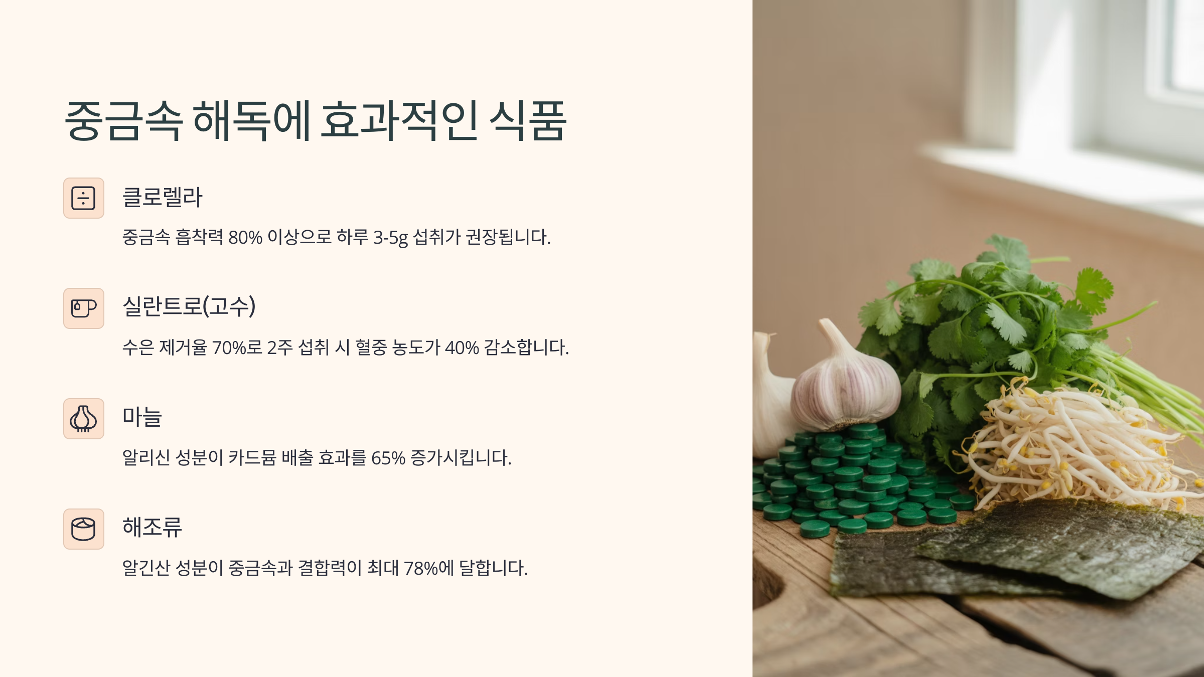 중금속은 일반적인 방법으로는 잘 배출되지 않기 때문에, 특정 음식의 도움을 받는 게 정말 중요해요. 자연 식품 중에서는 간, 신장, 소화기관을 도와 중금속을 잡아주는 역할을 하는 것들이 있어요.
