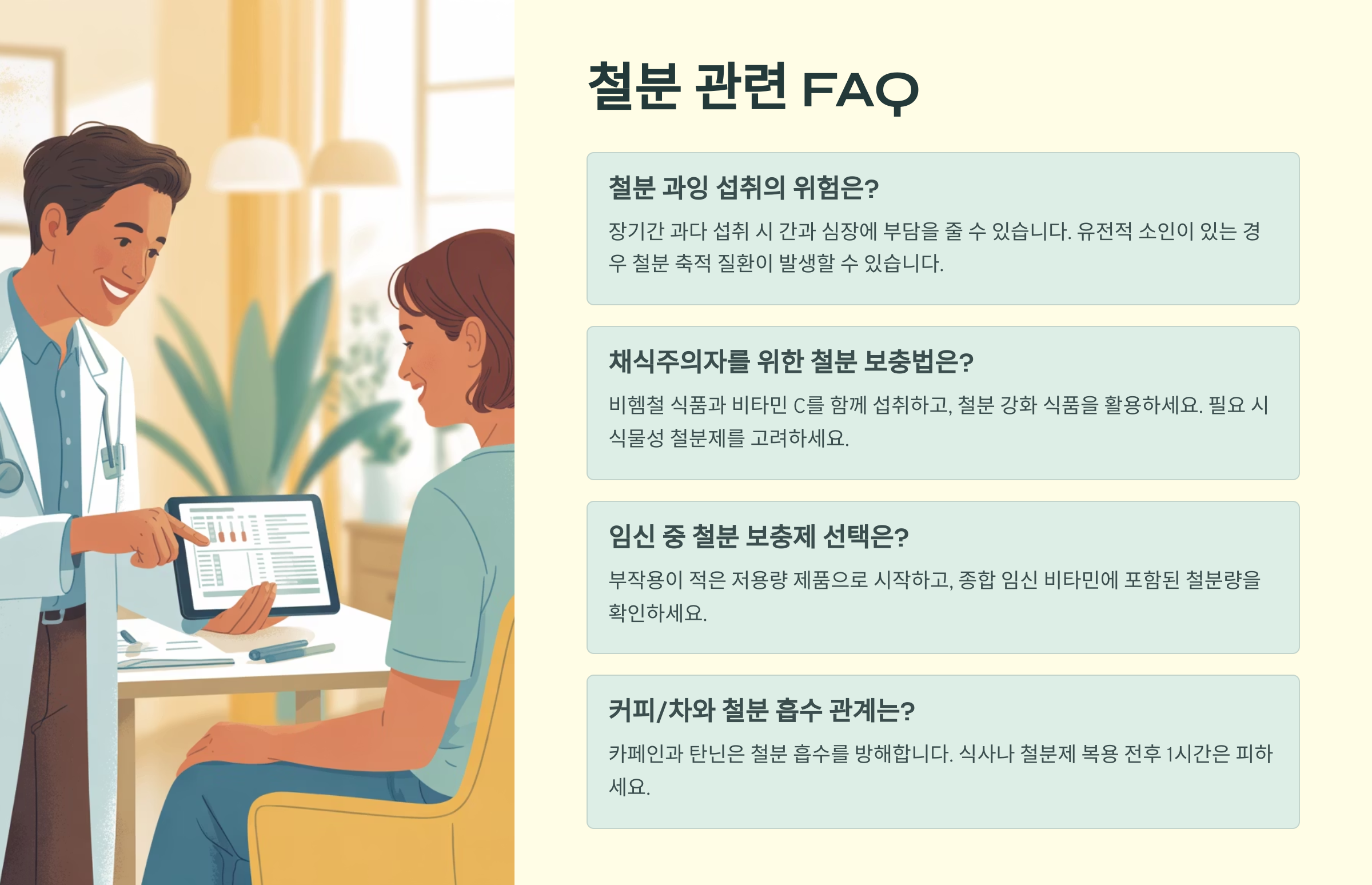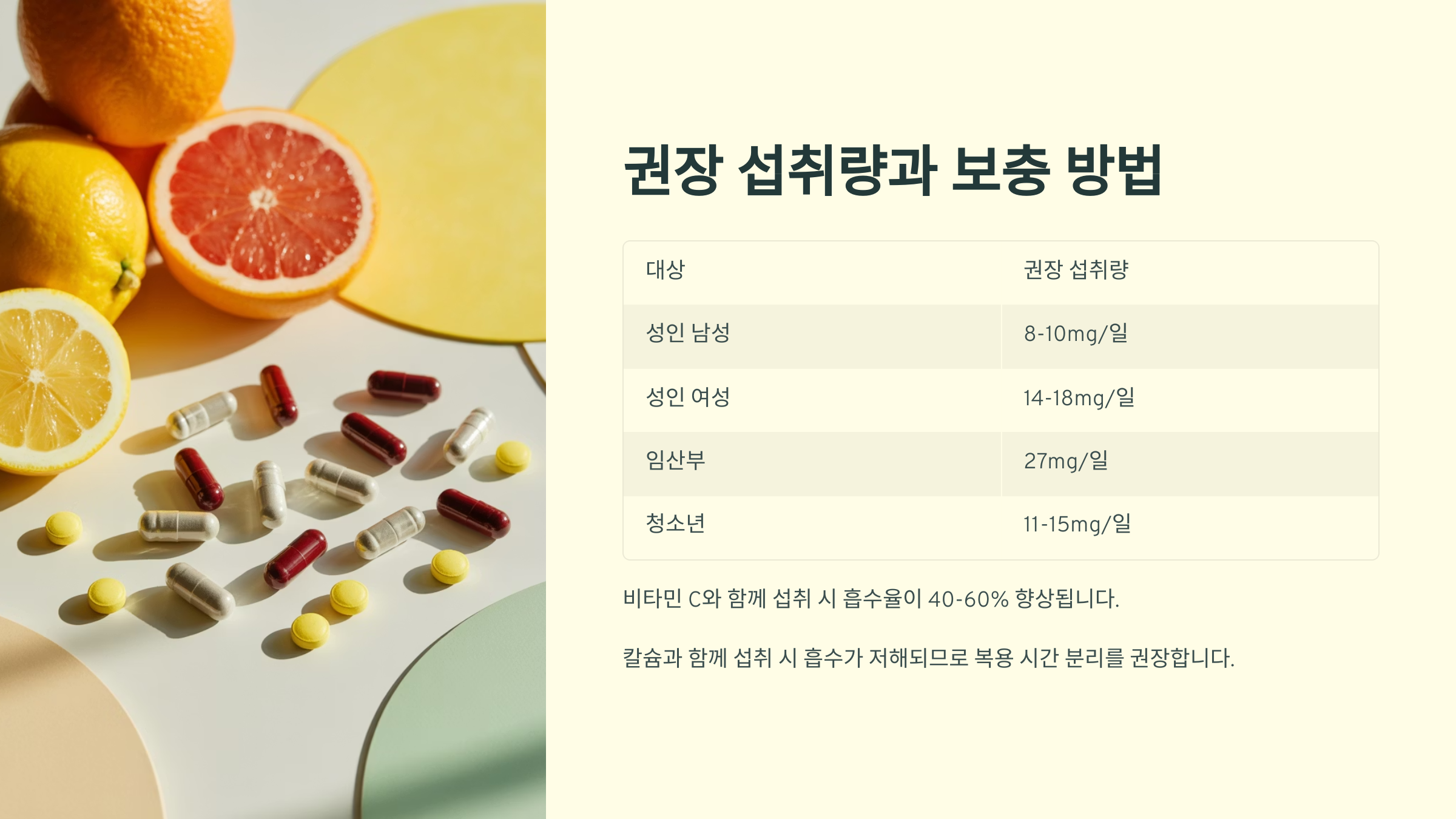 💡 복용 팁: 비타민C와 함께 먹으면 흡수율이 증가해요. 커피, 우유, 녹차는 철분 흡수를 방해하므로 2시간 간격을 두는 게 좋아요.