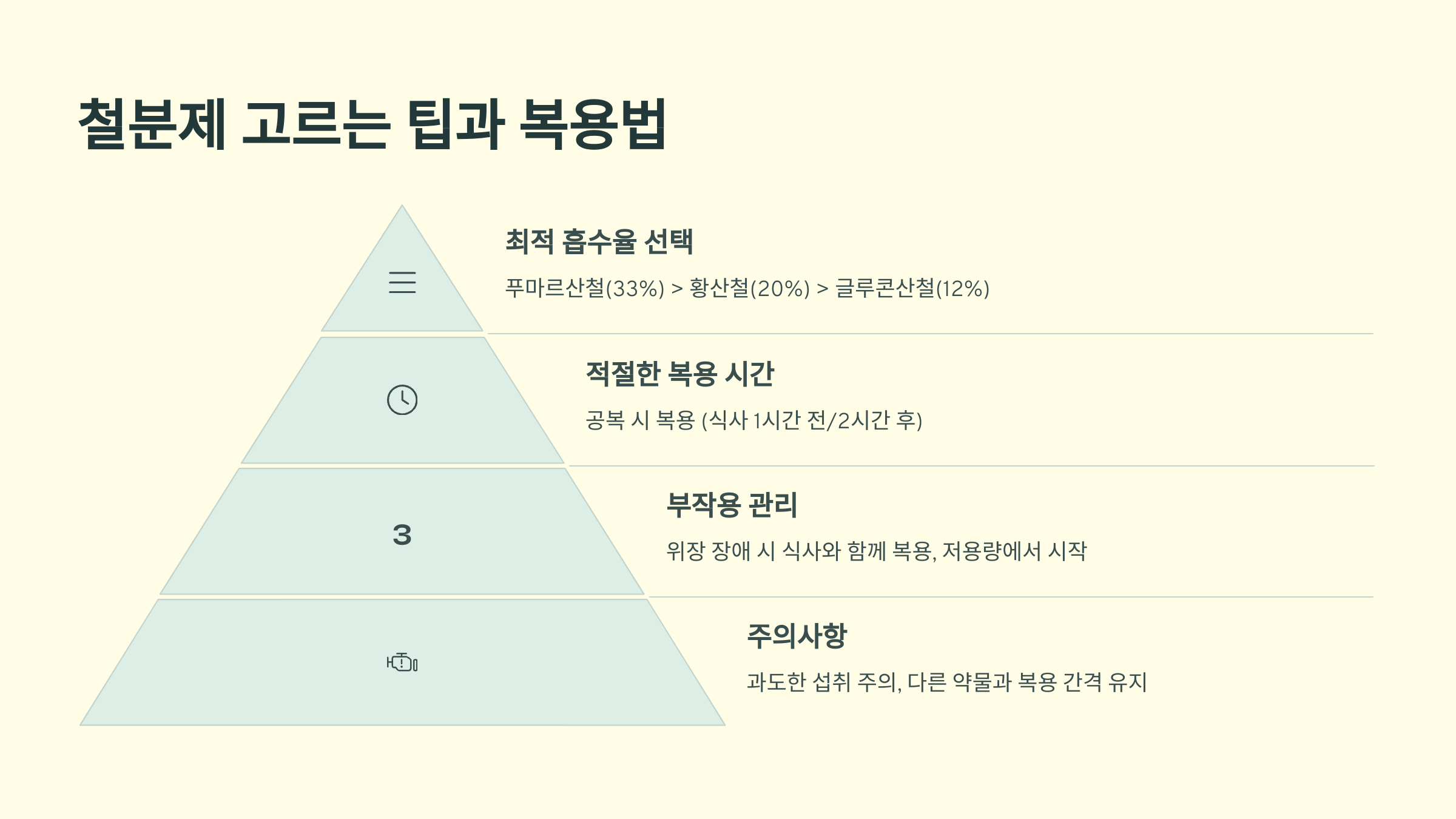 | 푸마르산제일철 | 높음 | 변비 가능성 있음 | 심한 빈혈 |
