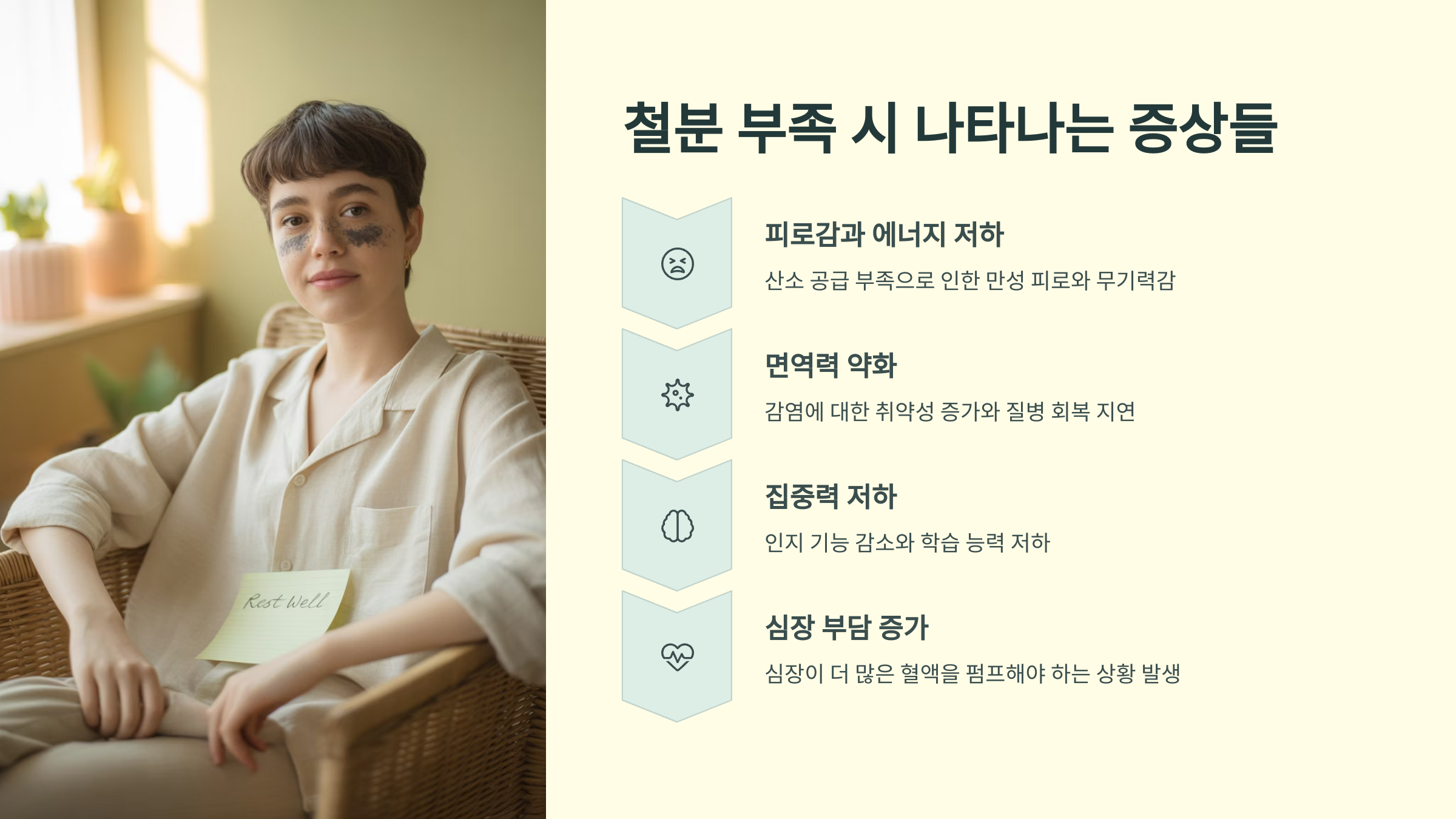 1️⃣ 만성 피로 아무리 잠을 자도 피로가 해소되지 않는다면 철분 결핍이 원인일 수 있어요.