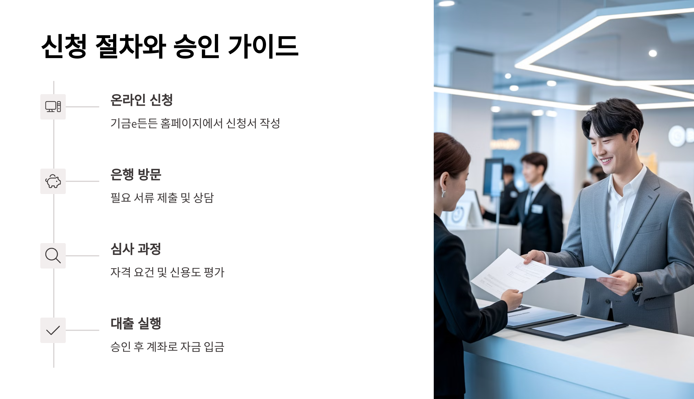 사전 상담은 국민은행, 우리은행, 신한은행, 농협 등에서 가능하고, 상담 후 대상 여부 확인이 되면 필요한 서류를 제출하고 본 심사에 들어가요.