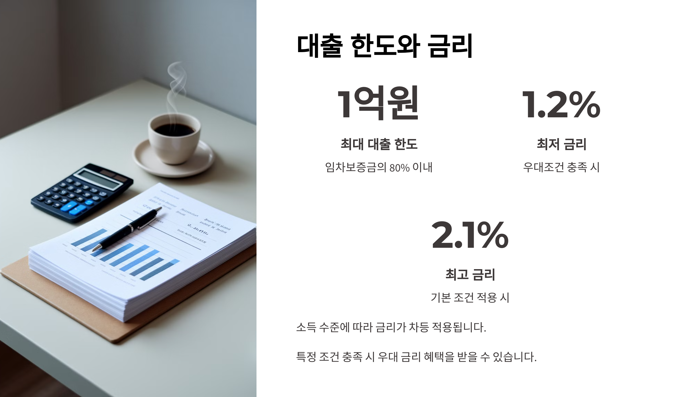 금리는 정부가 이자 일부를 지원하는 방식으로, 연 1.2%~2% 내외로 아주 낮은 편이에요. 일반 전세대출 금리와 비교하면 절반 이하인 셈이죠.
