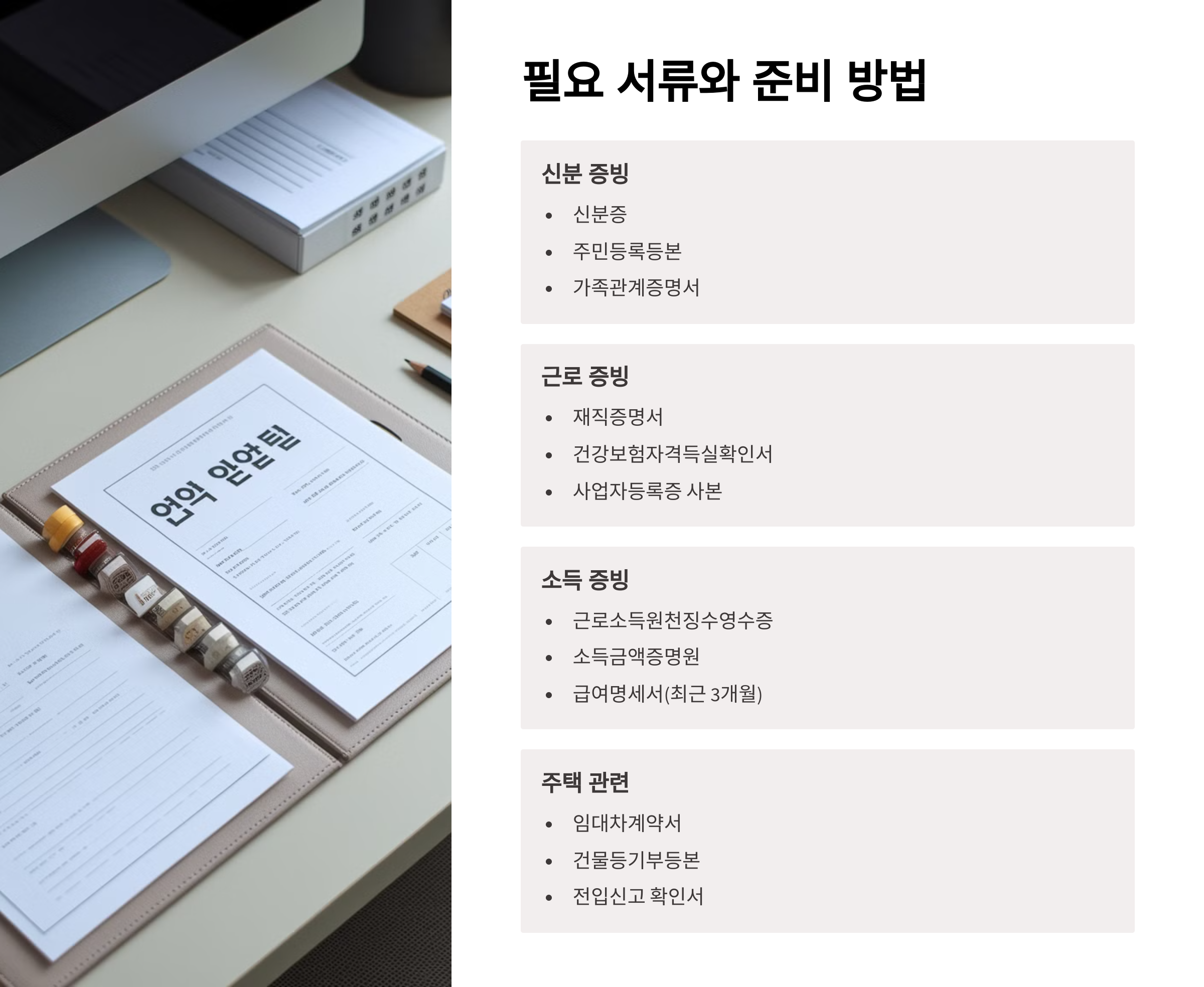 가장 기본은 신분증, 주민등록등본, 가족관계증명서예요. 여기에 근로소득원천징수영수증, 건강보험자격득실확인서, 소득금액증명원도 함께 필요해요.