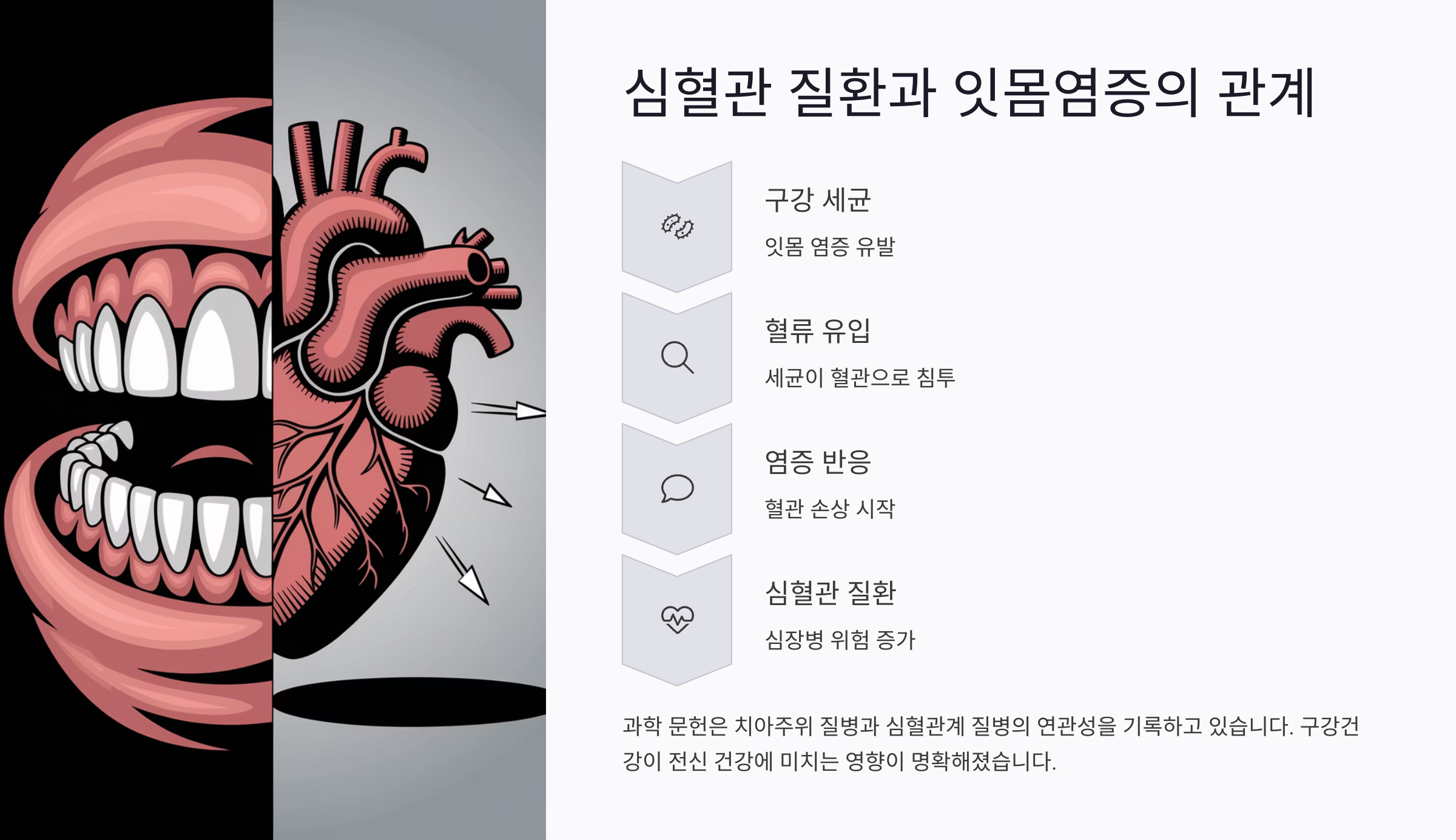 특히 동맥경화, 심근경색, 뇌졸중 등은 구강 세균에 의해 유발된 만성 저강도 염증 상태와 관련이 깊어요. 미국심장학회(ACC)와 대한치주과학회 모두 “잇몸 건강이 심장 건강의 시작”이라고 강조하고 있어요.