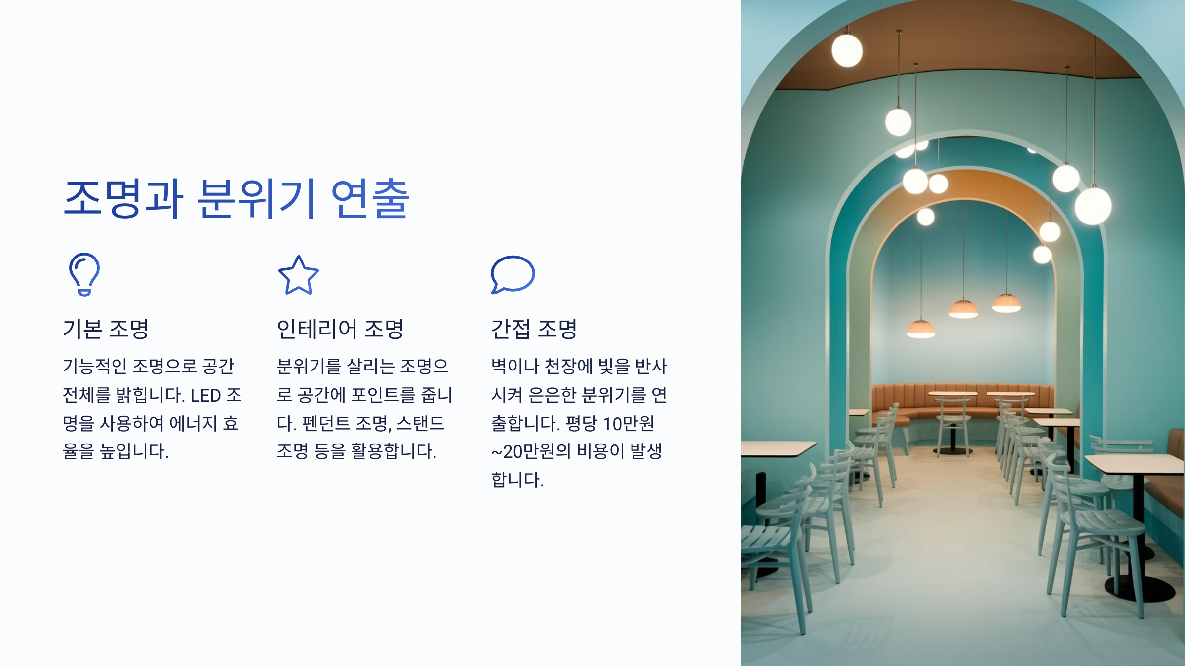 조명 설치 비용은 개당 5만 원에서 20만 원까지 다양하고, 공간에 따라 수십 개가 들어가기도 해요. 포인트 조명, 천장 매입 조명, 테이블 위 펜던트 조명까지 다 달라서 조명 설계도 따로 해야 하죠.