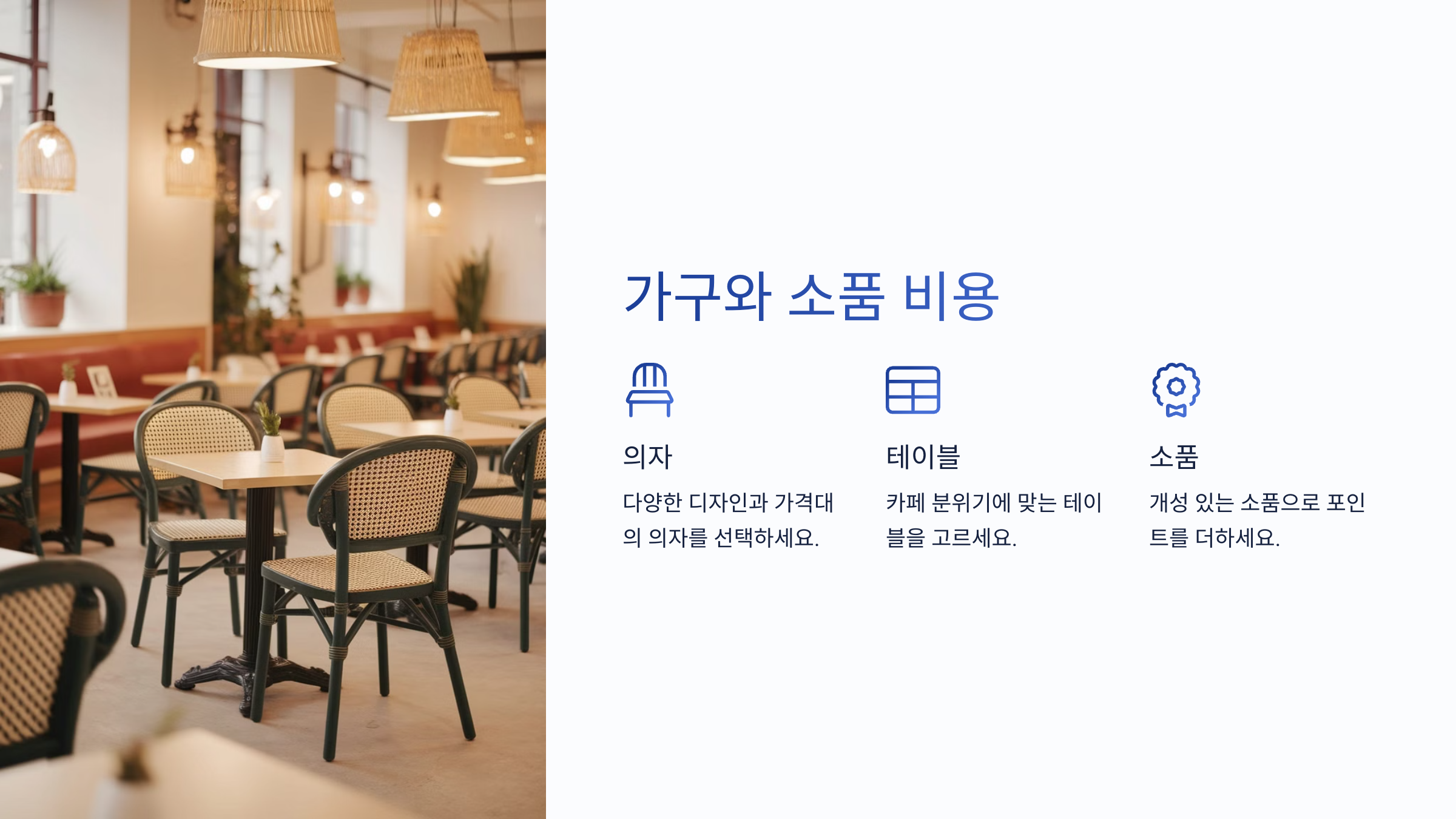 카페의 매력을 더해주는 요소 중 하나가 바로 가구와 소품이에요. 테이블, 의자, 선반, 조명, 식물까지 작은 부분들이 모여 전체 분위기를 완성하거든요. 그런데 이 부분도 은근히 비용이 많이 들어요.