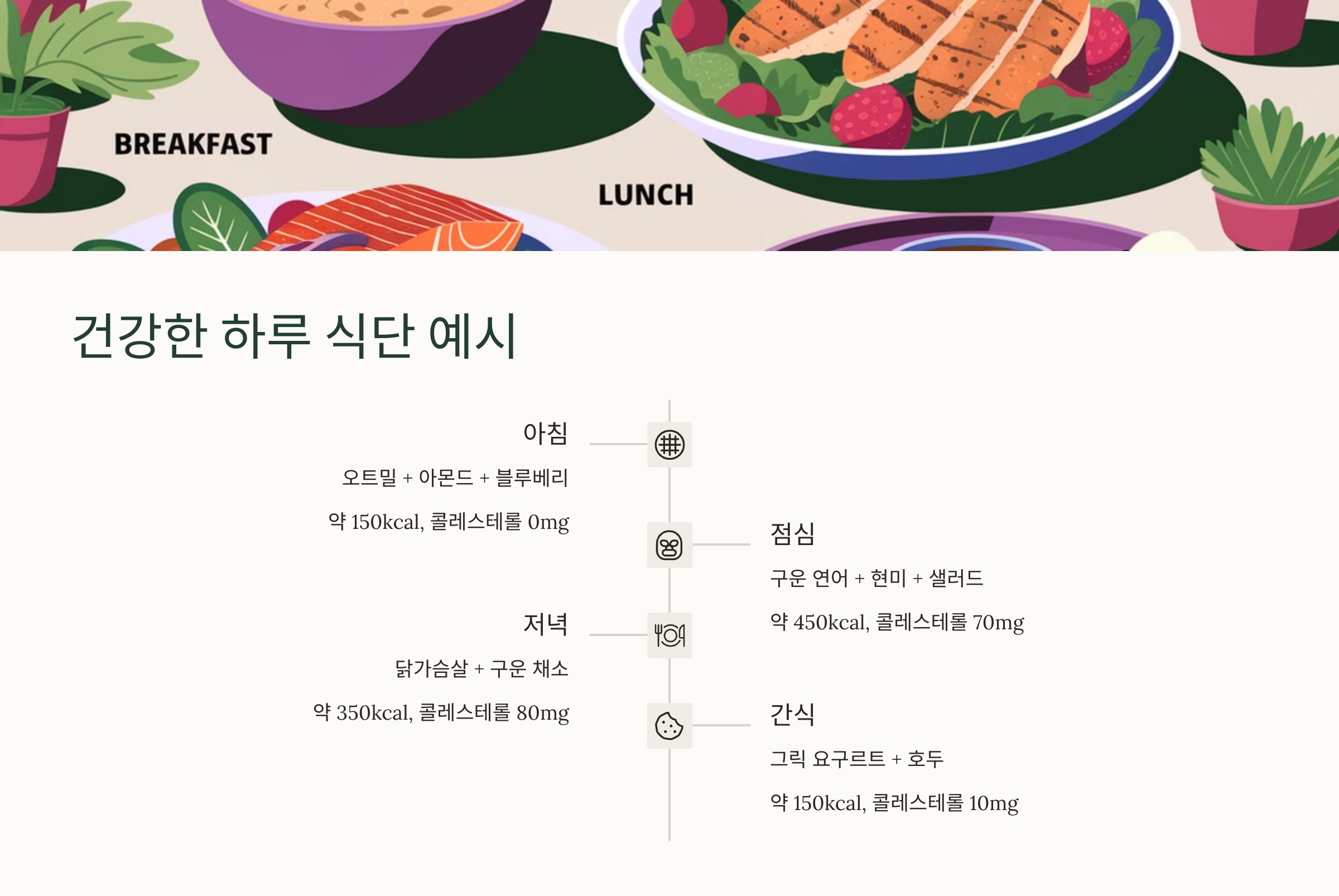 콜레스테롤을 낮추기 위한 식단은 어렵지 않아요! 다양한 채소와 통곡물, 등푸른 생선, 견과류를 중심으로 식단을 구성하면 누구나 쉽게 따라할 수 있어요.
