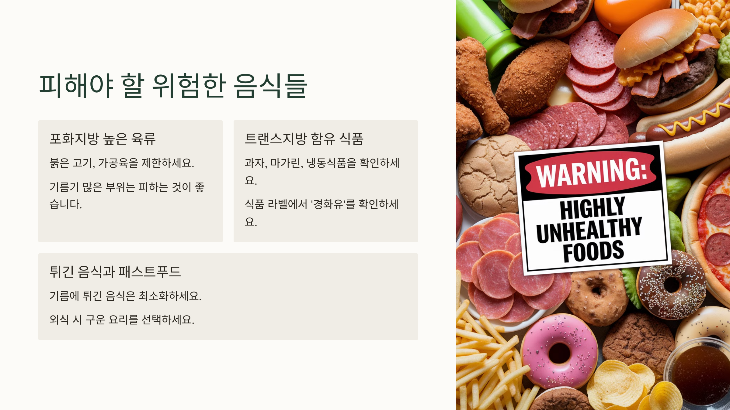 콜레스테롤 수치를 낮추려면 피해야 할 음식들도 있어요. 특히 포화지방과 트랜스지방이 많은 식품들은 콜레스테롤을 급격히 높일 수 있으니 주의해야 해요.