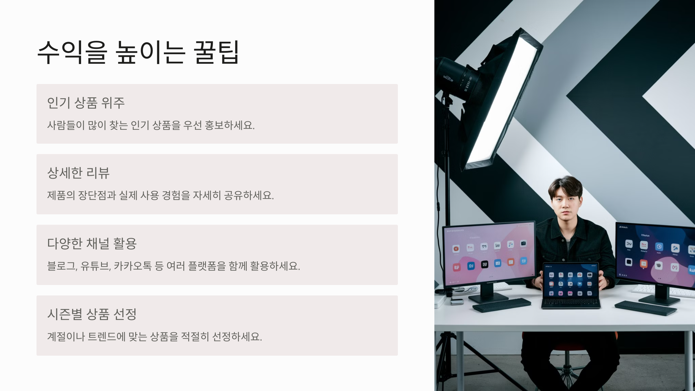 | 일관된 테마 유지 | 블로그/채널 주제에 맞는 상품 추천 |