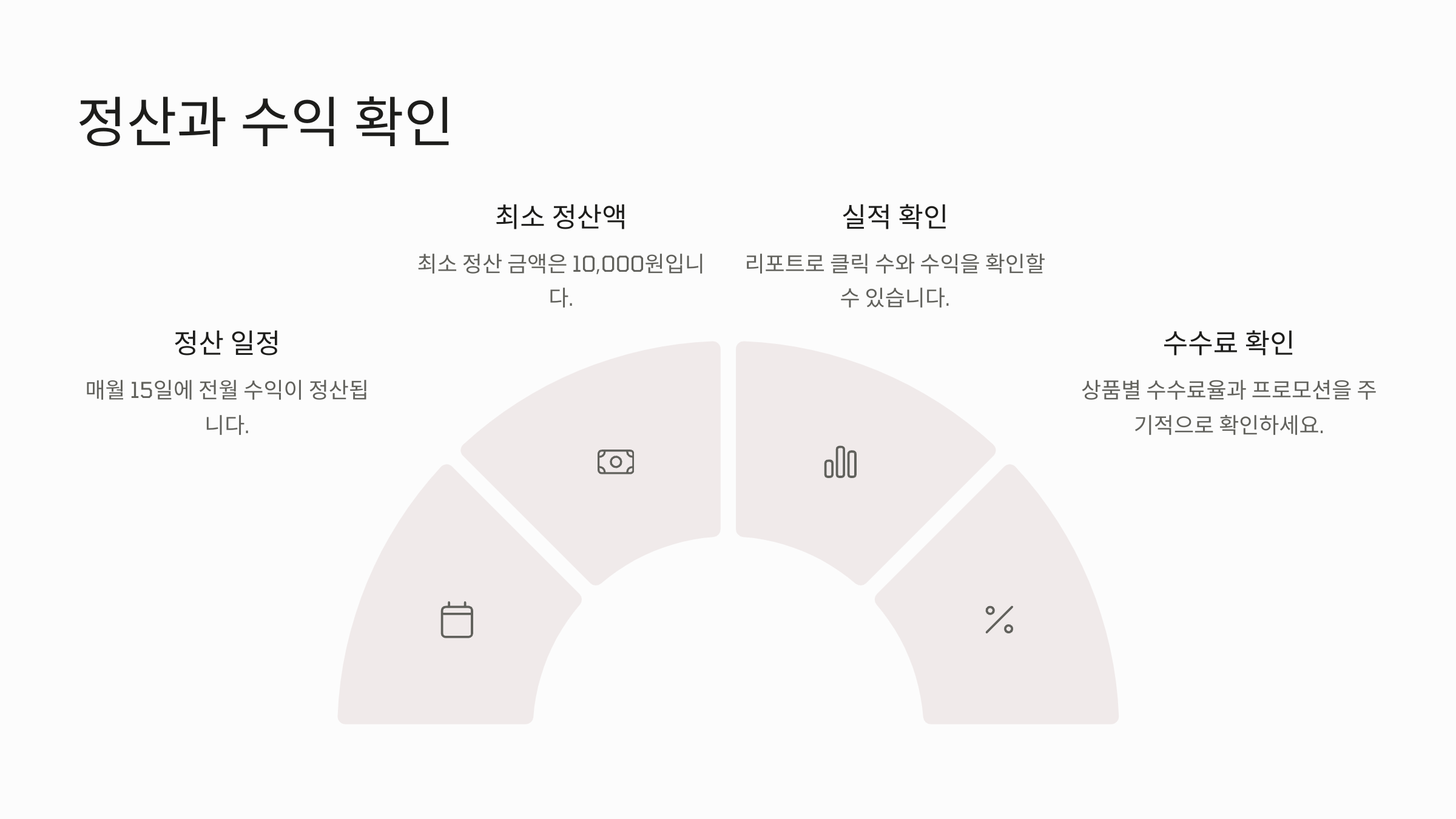 | 정산 기준 | 매월 1일~말일까지 누적 수익 |