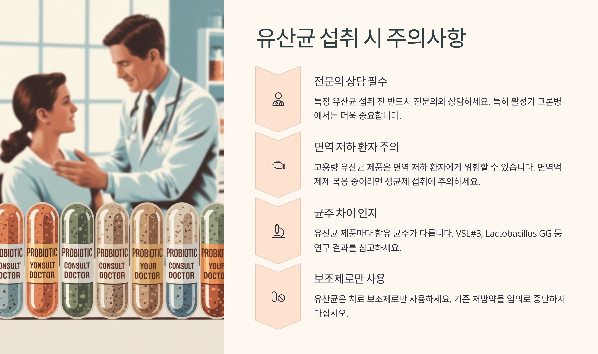 이제 어떤 유산균이 크론병에 효과적인지 더 확실히 알게 됐죠? 그럼 다음에는 유산균을 복용할 때 주의해야 할 점들을 정리해볼게요. 👍